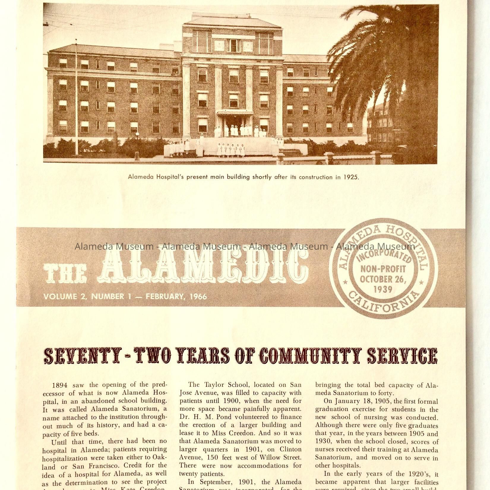 History of Object: Bulletin issued by the Alameda Hospital entitled "The Alamedic” (volume 2, number 1), February, 1966. It includes an article "Seventy-Two Years of Community Service'', giving the history of the hospital and illustrated with reproduction of early photos concerning the institution.