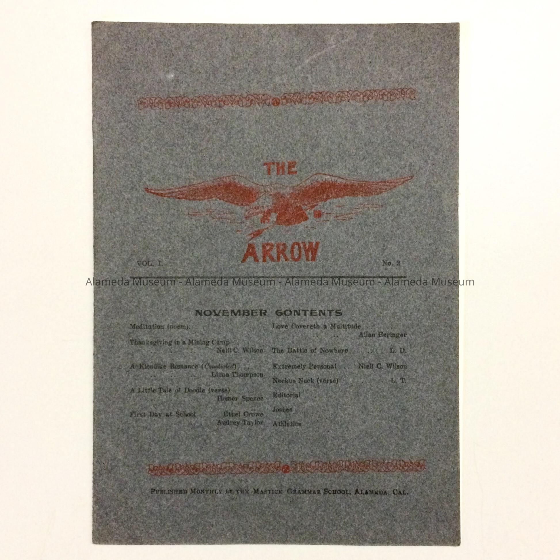 History of Object: A publication titled, "The Green Arrow, Vol. 1, #2; a monthly publication of the Mastick Grammar School, Alameda. The contents were written by an editorial staff composed of students. A relative of the donor, Neill C. Wilson was the editor. This publication appears to be subsidized by displays bought by local merchants.