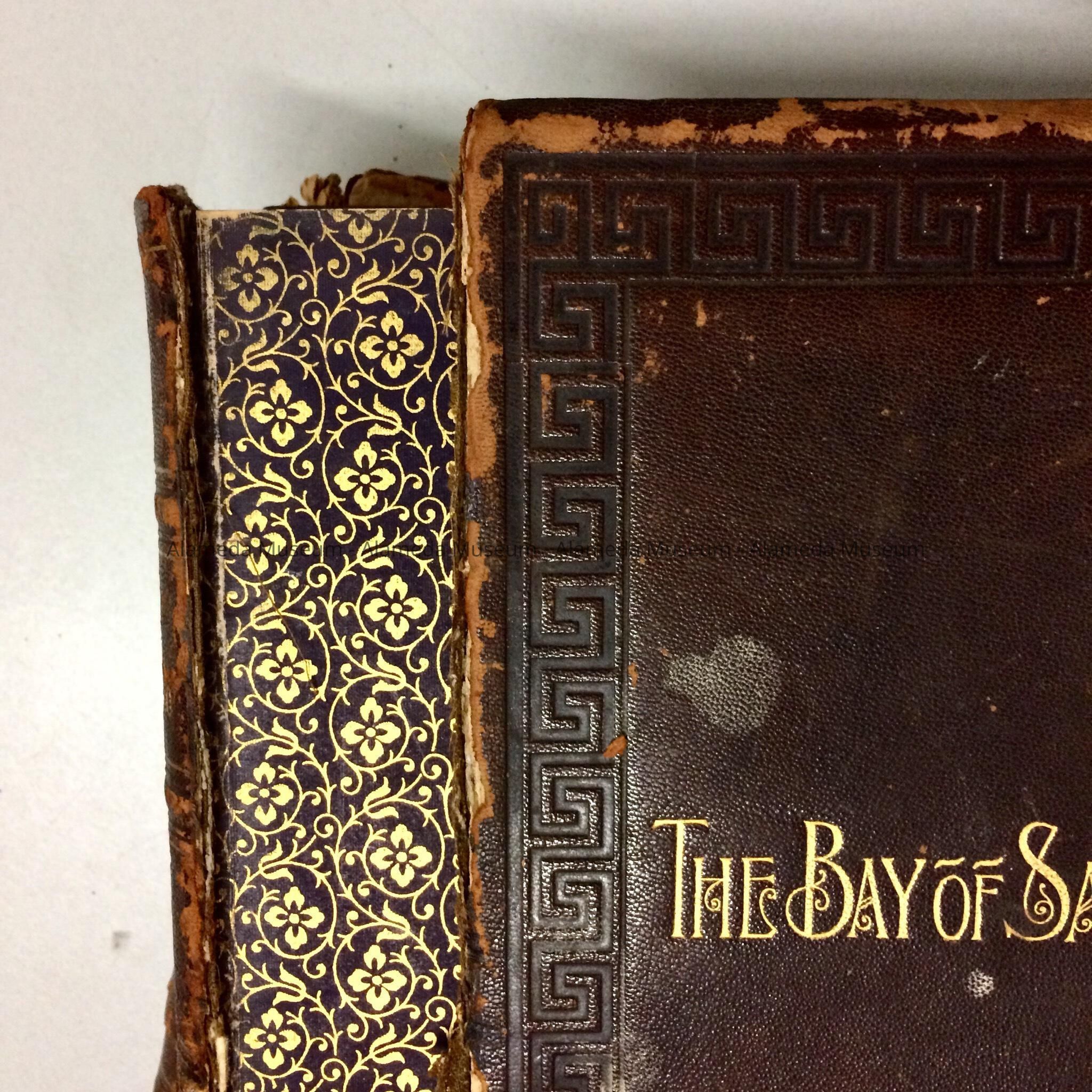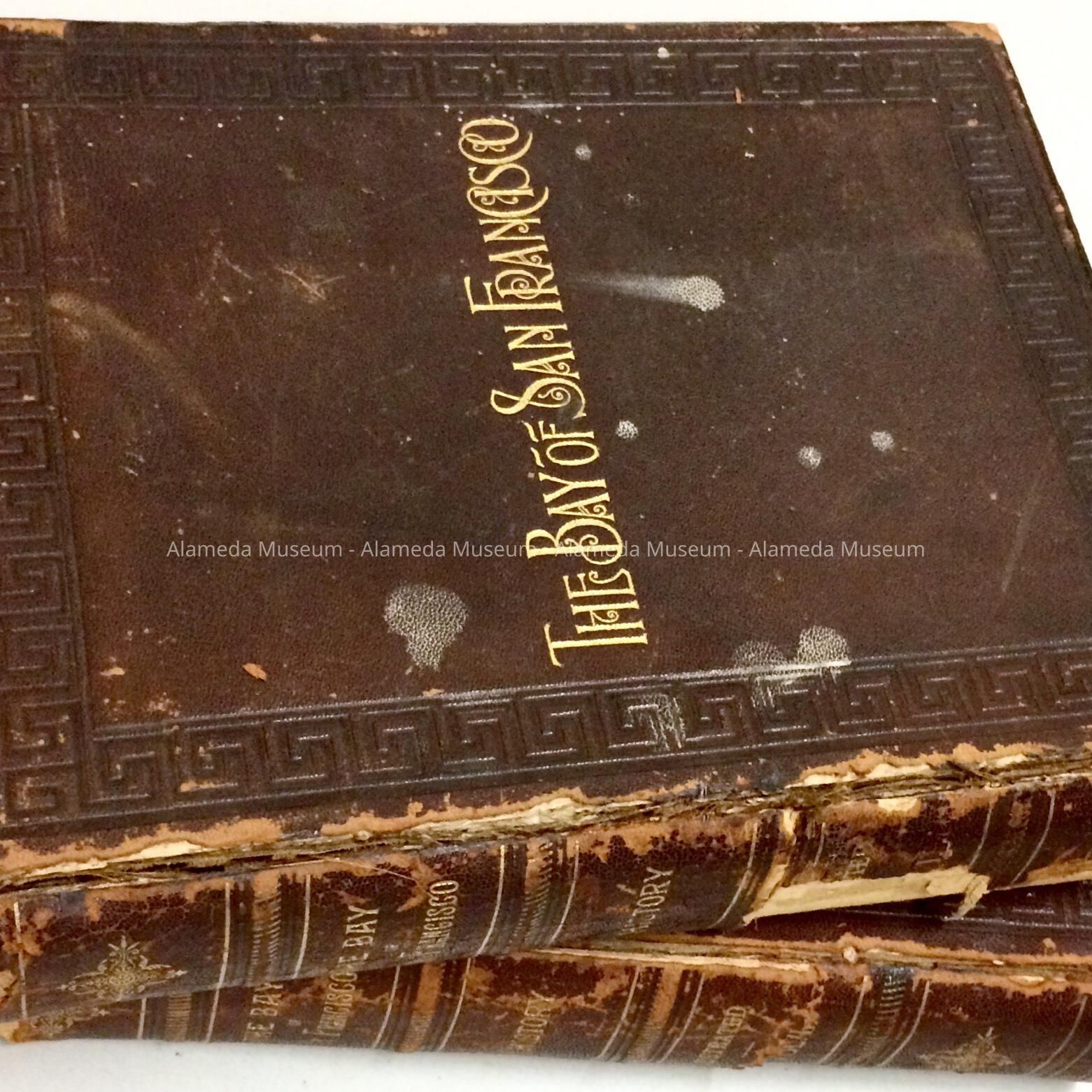 DESCRIPTION: TWO VOLUMES WITH LEATHER COVERS. COVER TITLES ARE "THE BAY OF SAN FRANCISCO." CAPTIONS ARE IN GOLD COLORED TYPE ON DARK BROWN COLORED BACKGROUNDS.