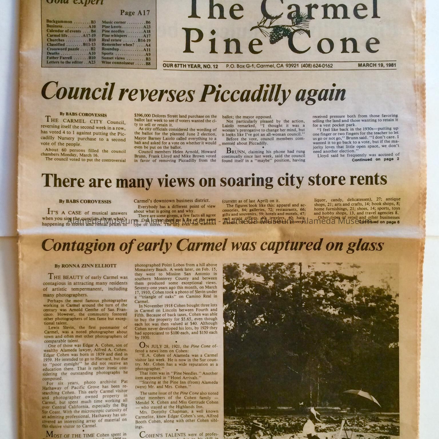 Description: Newspaper style publication entitled "The Carmel Pine Cone" dated March 19, 1981. Article is illustrated.