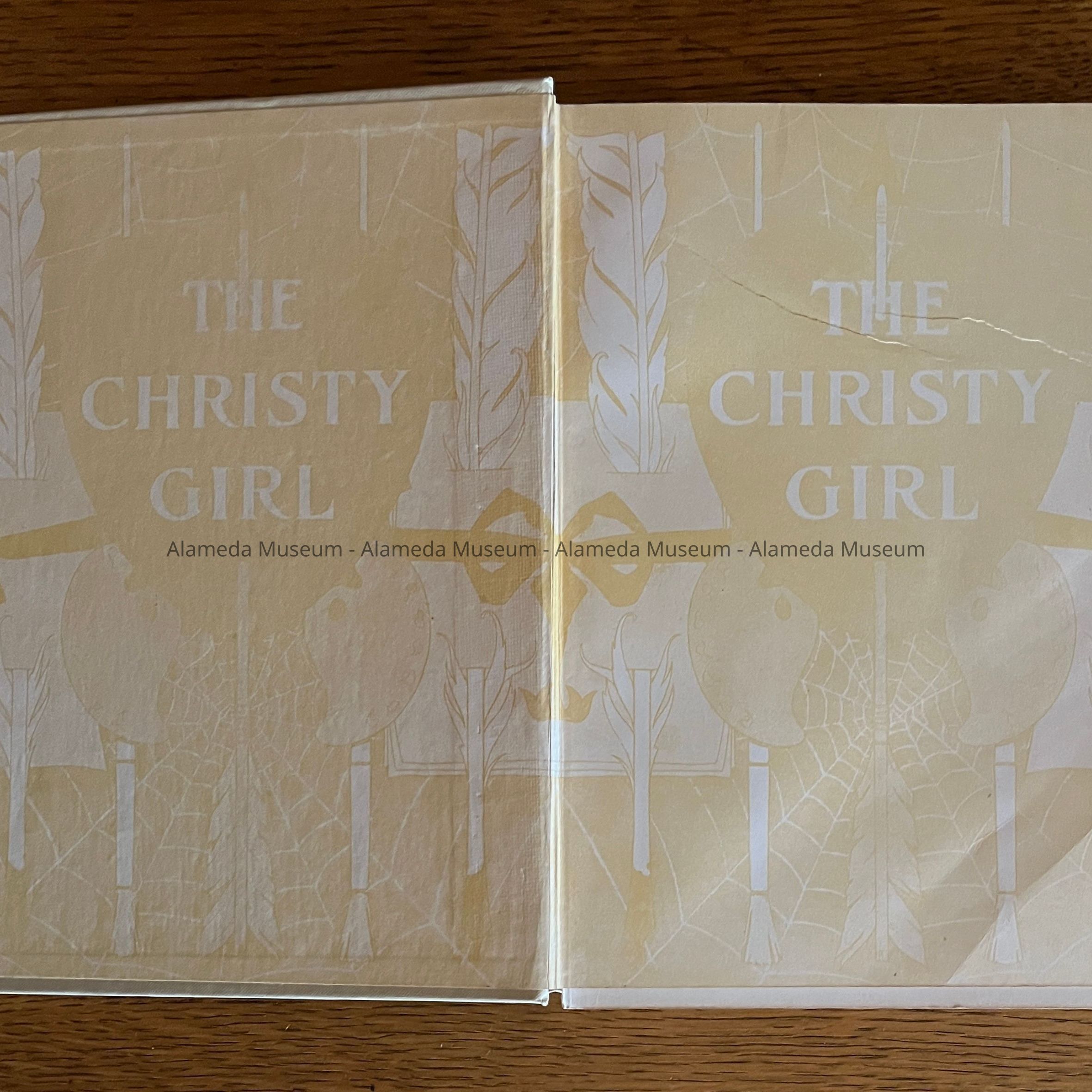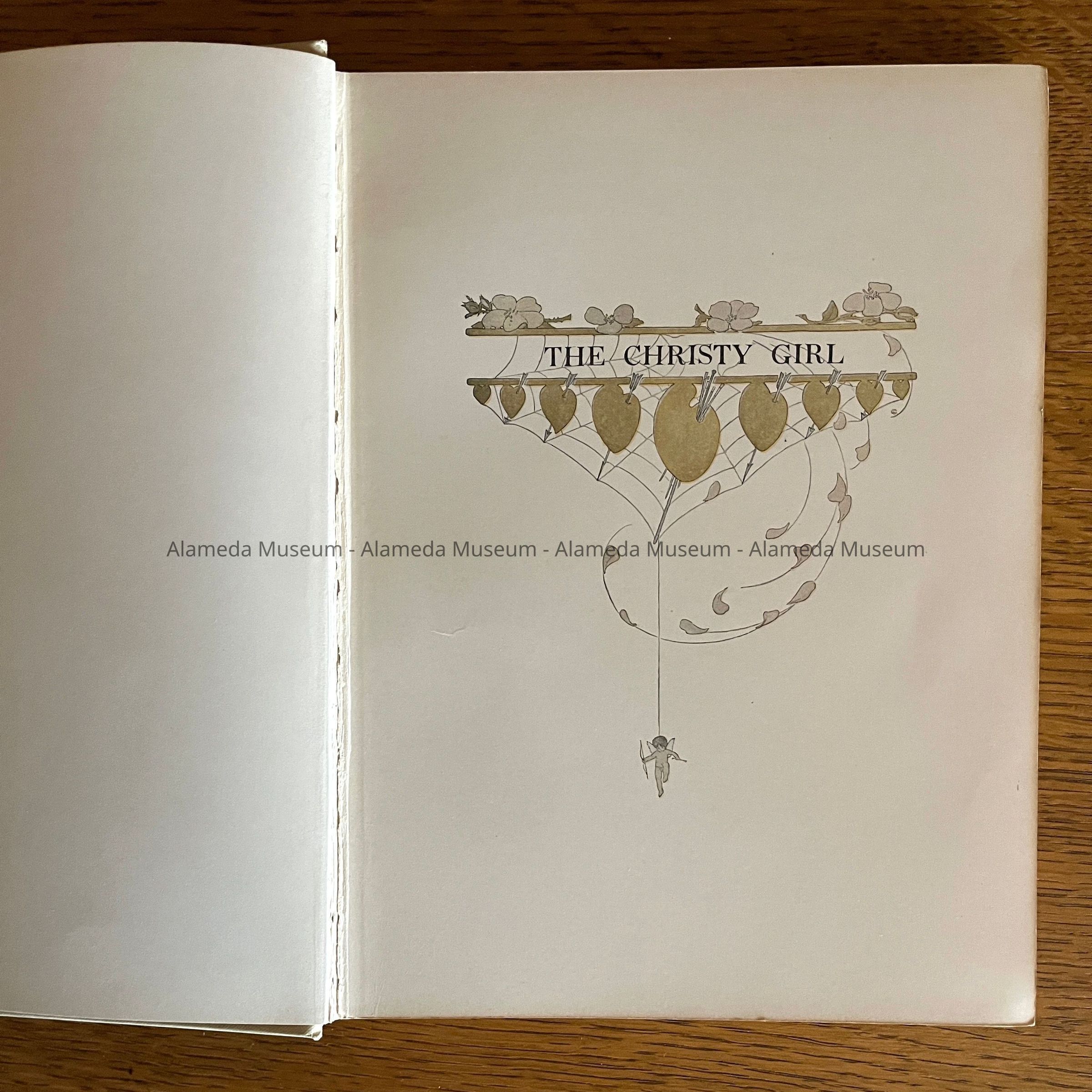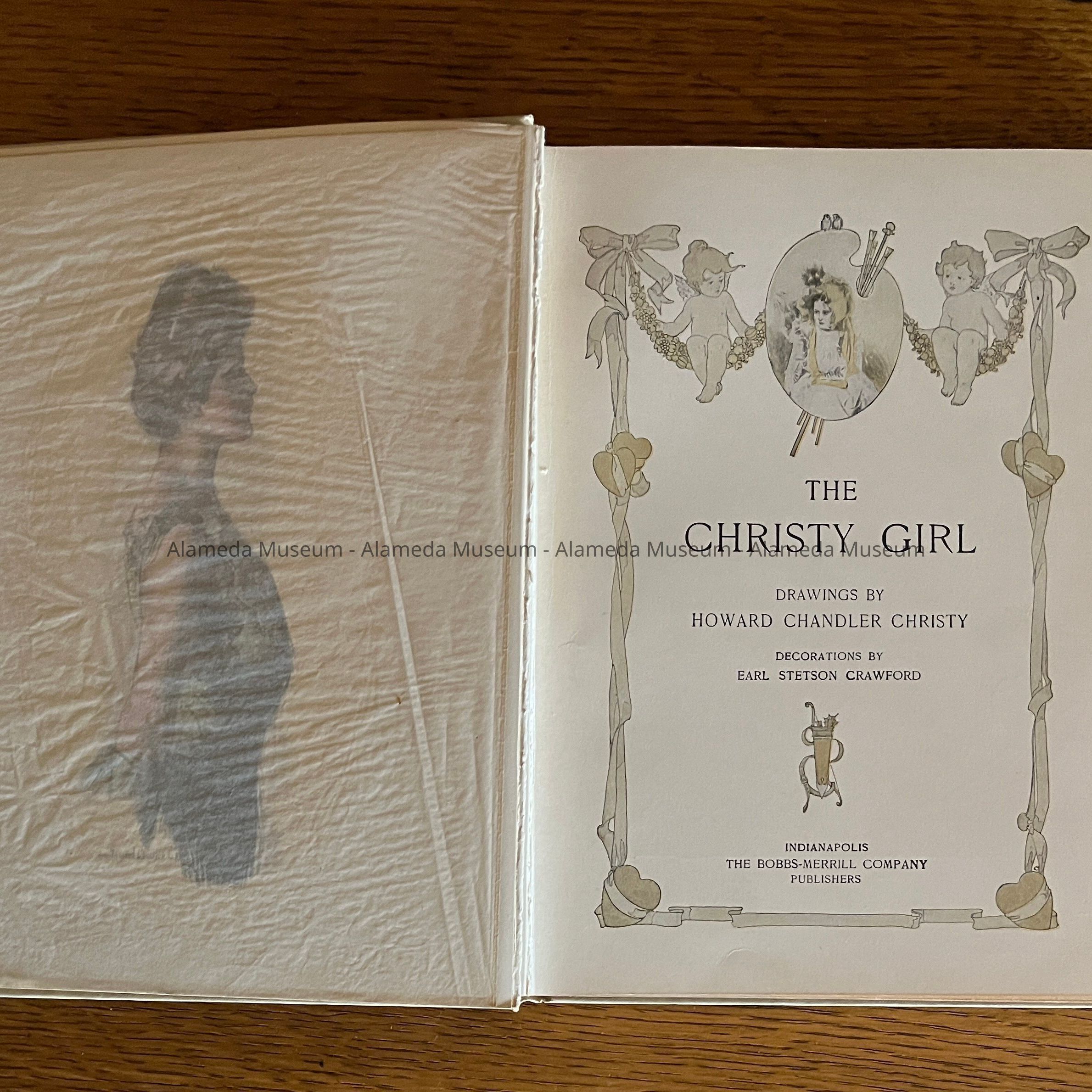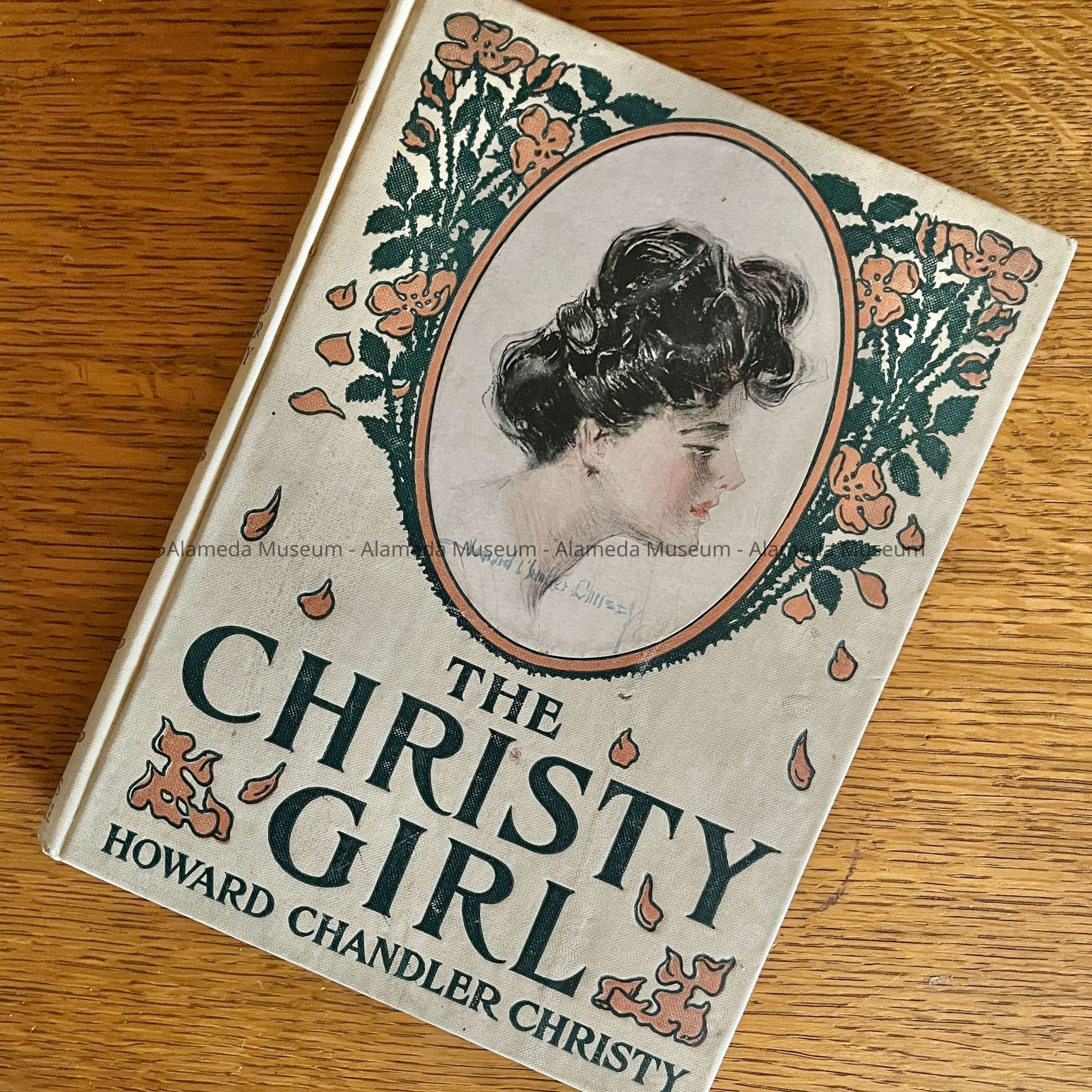 Hard-bound book with cover design of period-styled woman; design oval-shaped with flowers in colors of orange and green. Caption reads: The Christy Girl by Howard Chandler Christy. Published by Bobbs-Merrill Co., Publishers, c. 1906.