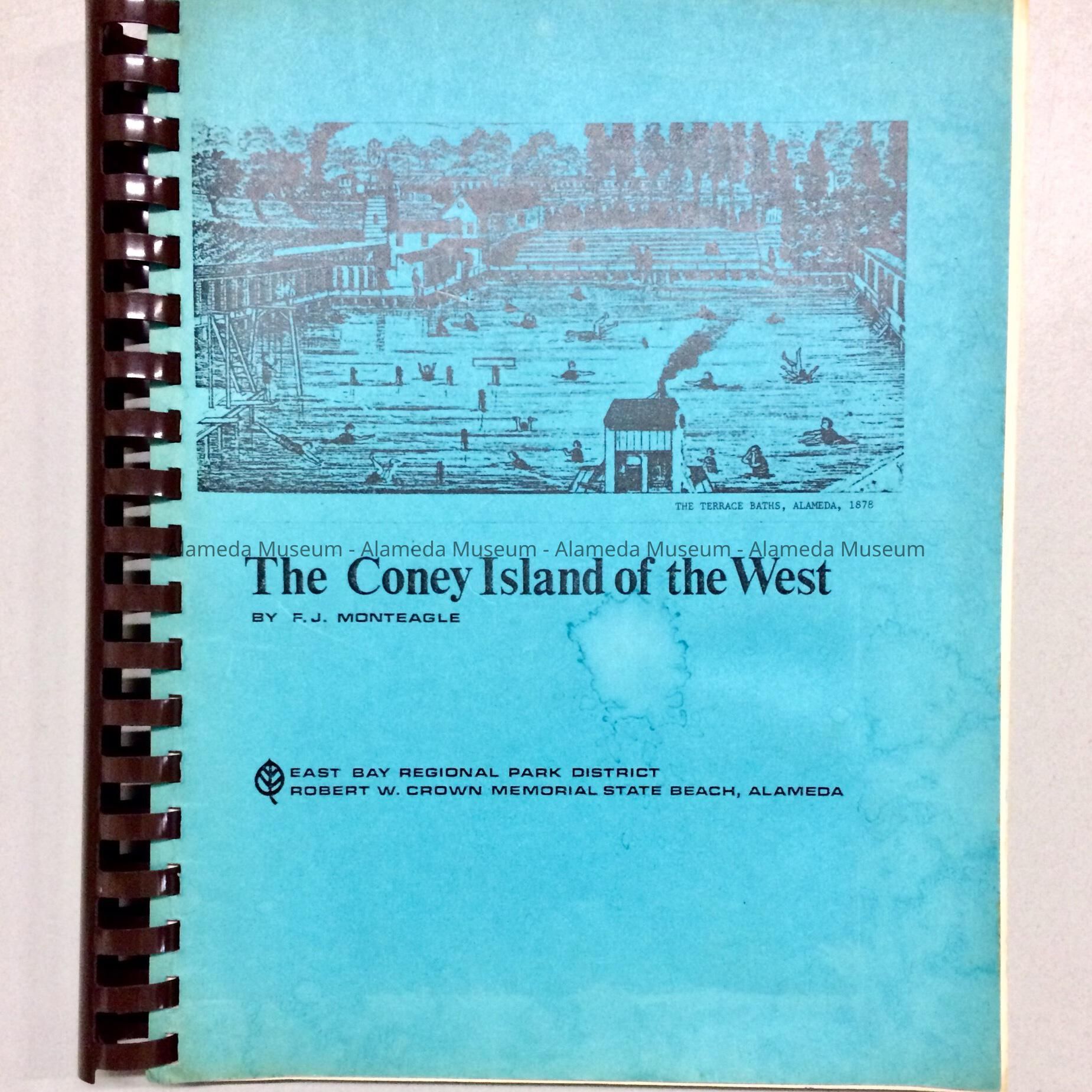 DESCRIPTION: A PLASTIC SPIRAL BOUND BOOK WITH ILLUSTRATED PAPER COVER. ILLUSTRATION INCLUDES "A VIEW OF TERRACE BATHS, ALAMEDA, 1878," AND BOLD-PRINTED CAPTION, "THE CONEY ISLAND OF THE WEST" IN BLACK-COLORED TYPE ON A BLUE COLORED BACKGROUND. THE BOOK WAS PRINTED UNDER THE AUSPICES OF THE EAST BAY REGIONAL PARK DISTRICT AND AUTHORED BY F.J. MONTEAGLE.