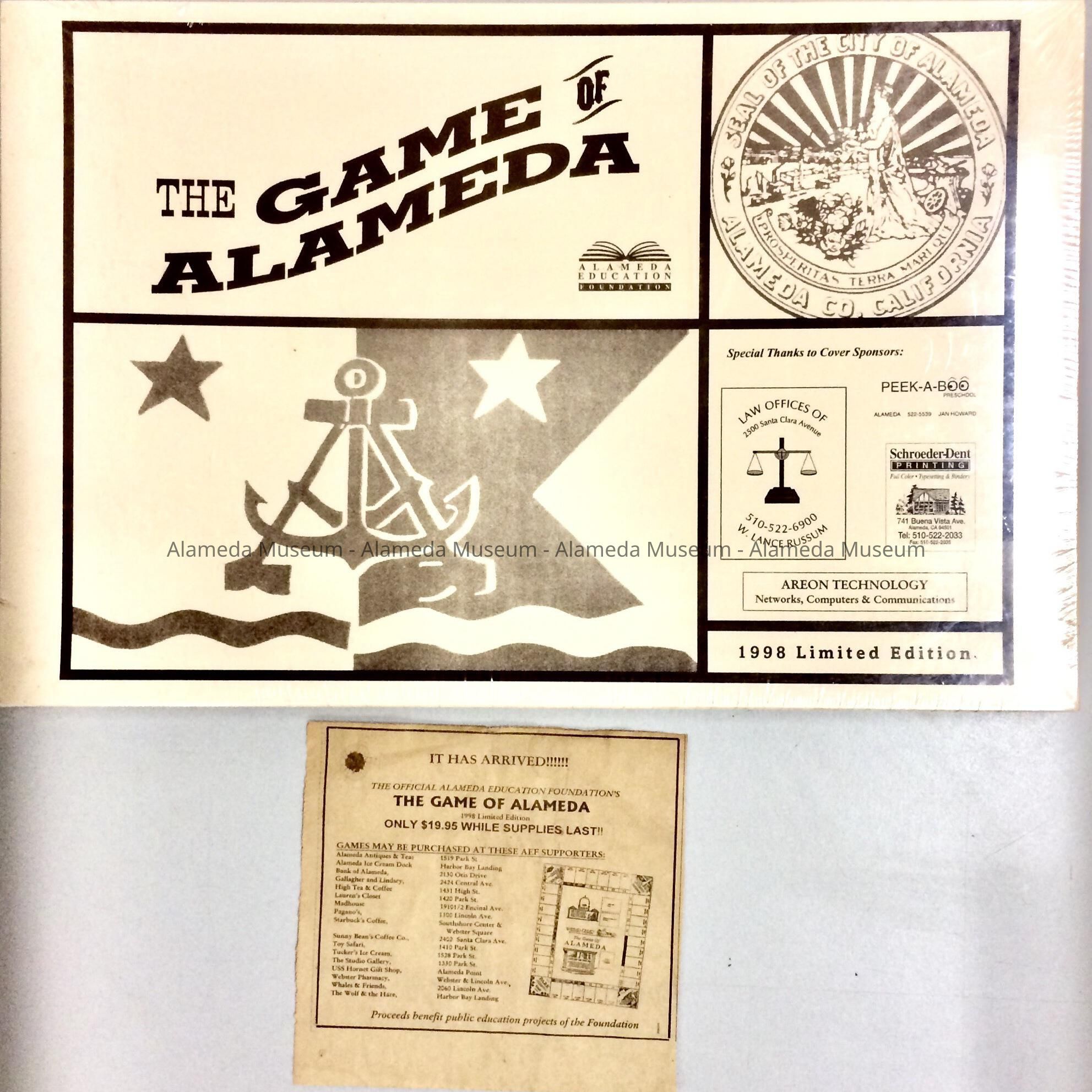 Description: A. flat off-white cardboard box, shrink-wrapped with plastic, with top design divided into five sections, top left stating 'the Game of Alameda' and 'Alameda Education Foundation' logo, top right box featuring the seal of Alameda, bottom left the logo, bottom left featuring special thanks and below that, '1998 Limited Edition'.