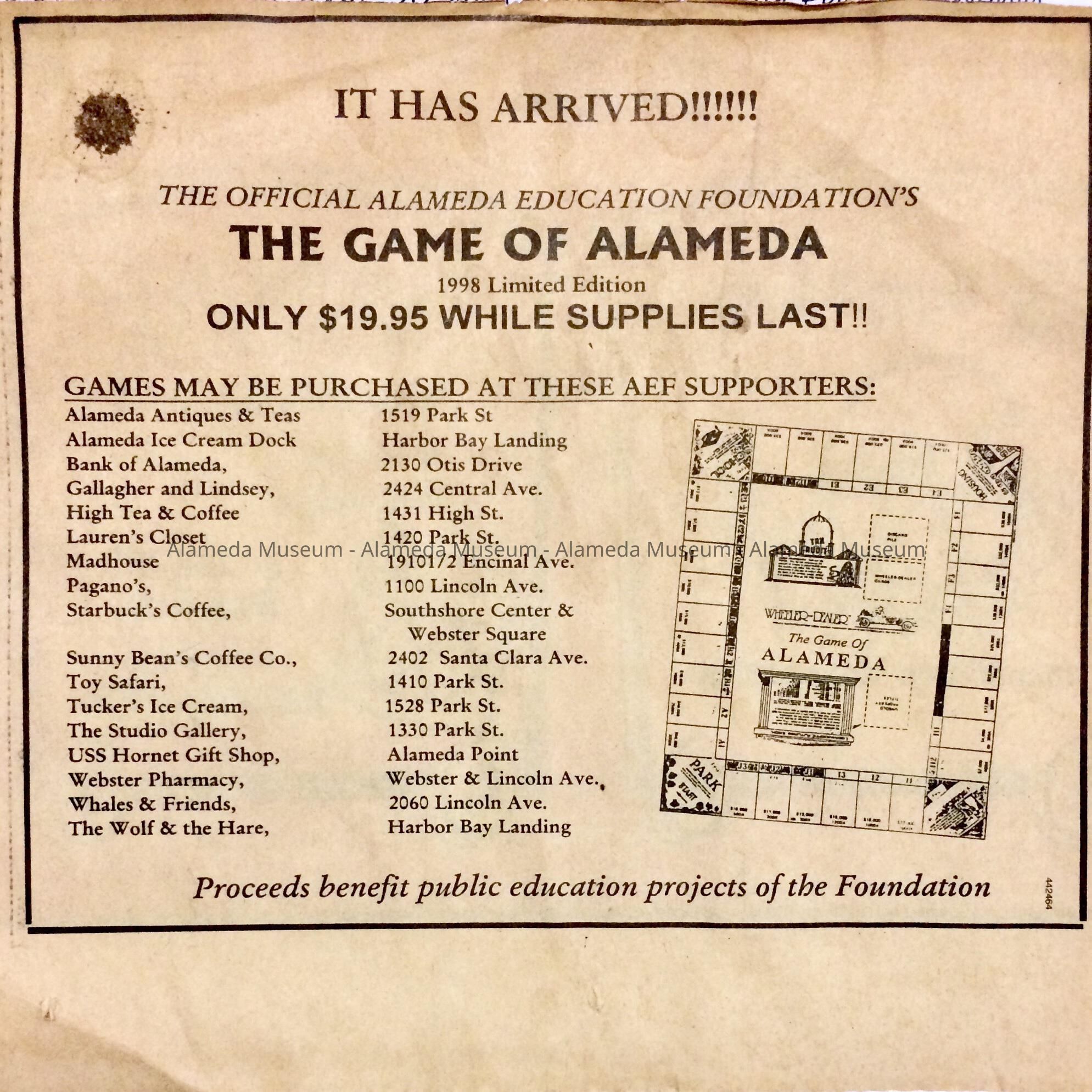 History of Object: Board game, made in 1998, and sold as fundraiser for the Alameda Education Foundation. Includes an information sheet featuring a picture of the Meyers House 'History of Alameda' with thanks to the Alameda Museum, fake money, a cardboard board featuring logos and addresses of businesses of the period, rules, dice, and play pieces.