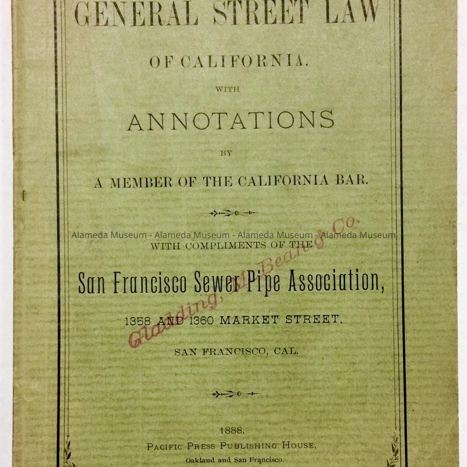 Booklet giving the general street law in California which was used as reference by the City Clerk of Alameda.