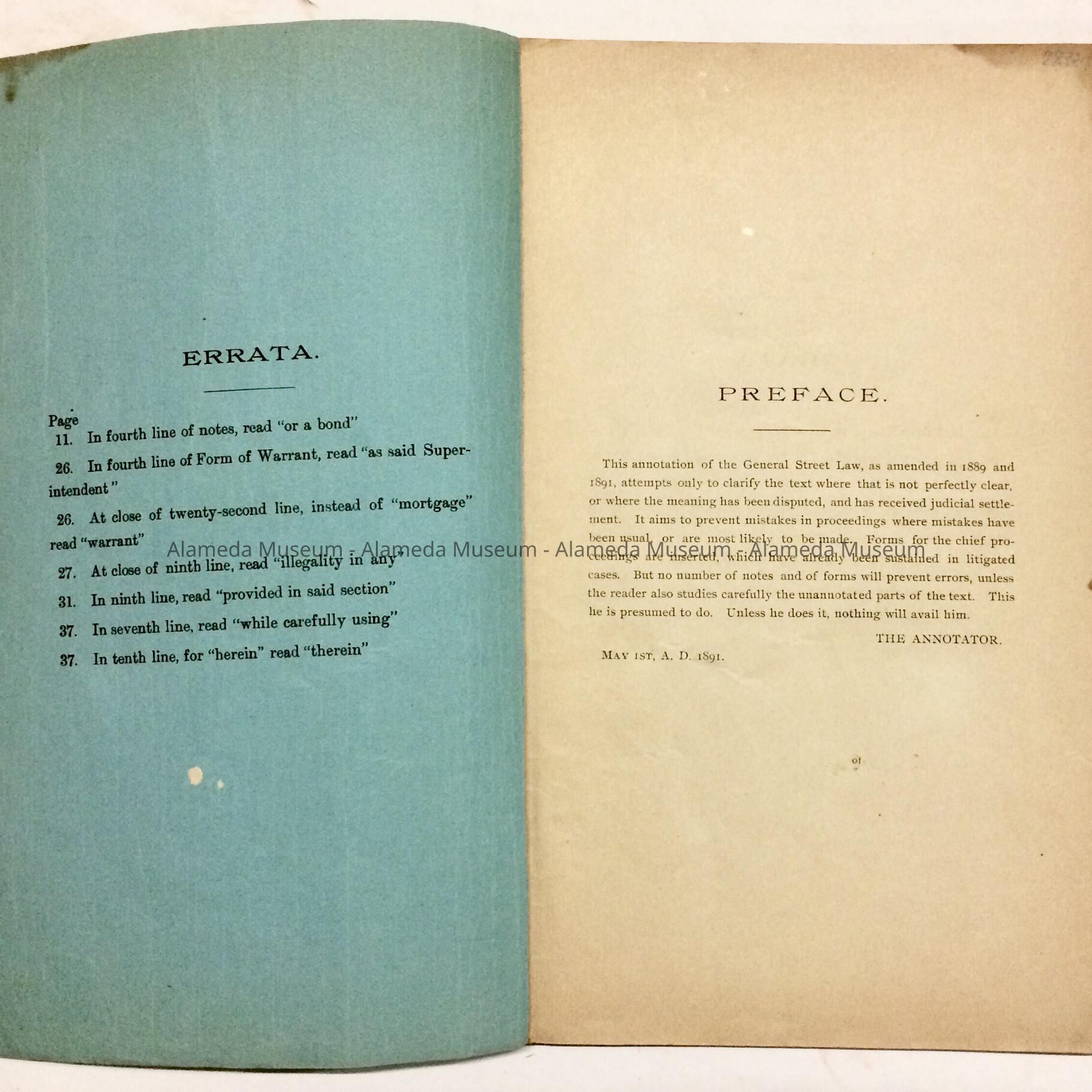 Reference book concerning the general street law in California dated 1891 and used by the City Clerk, Alameda.