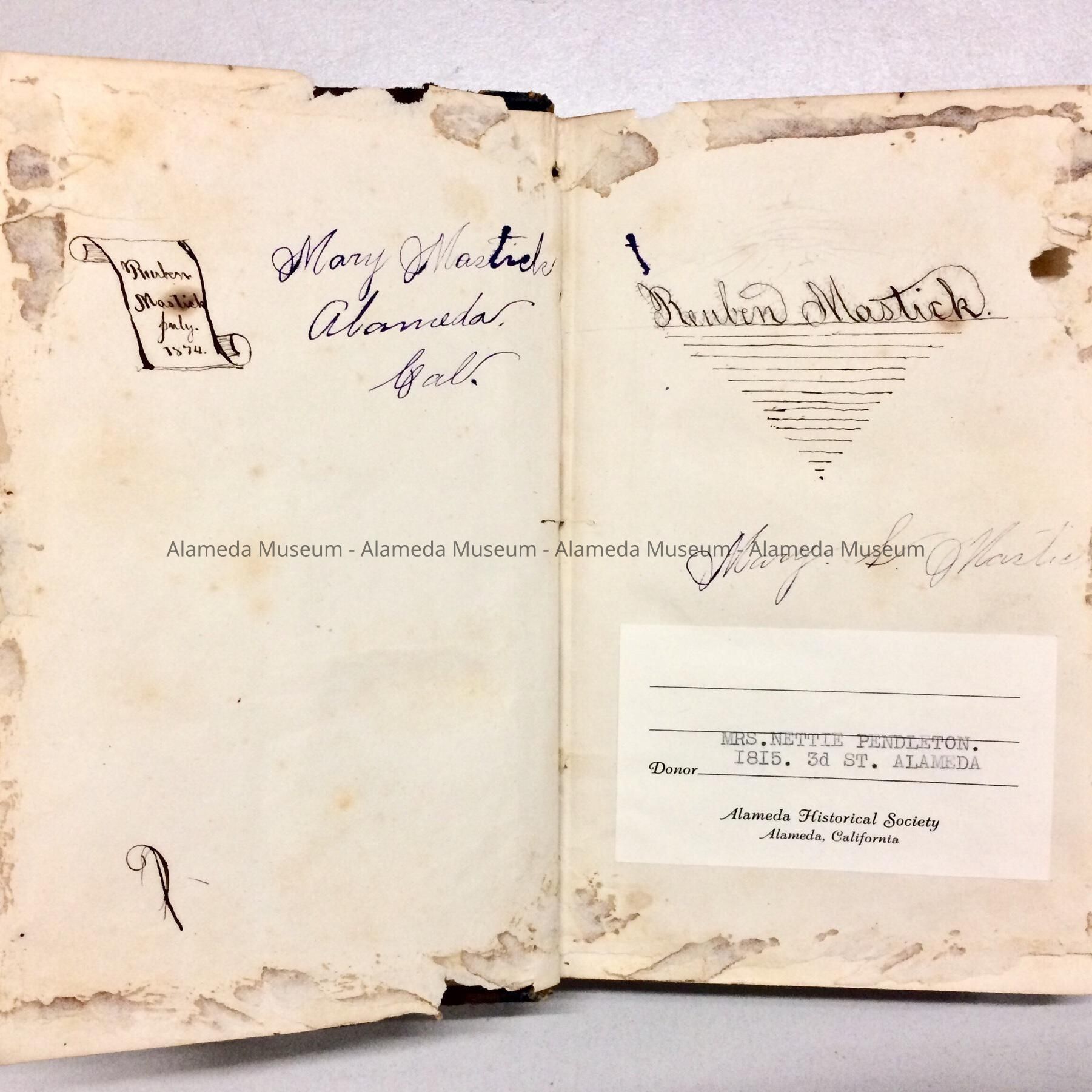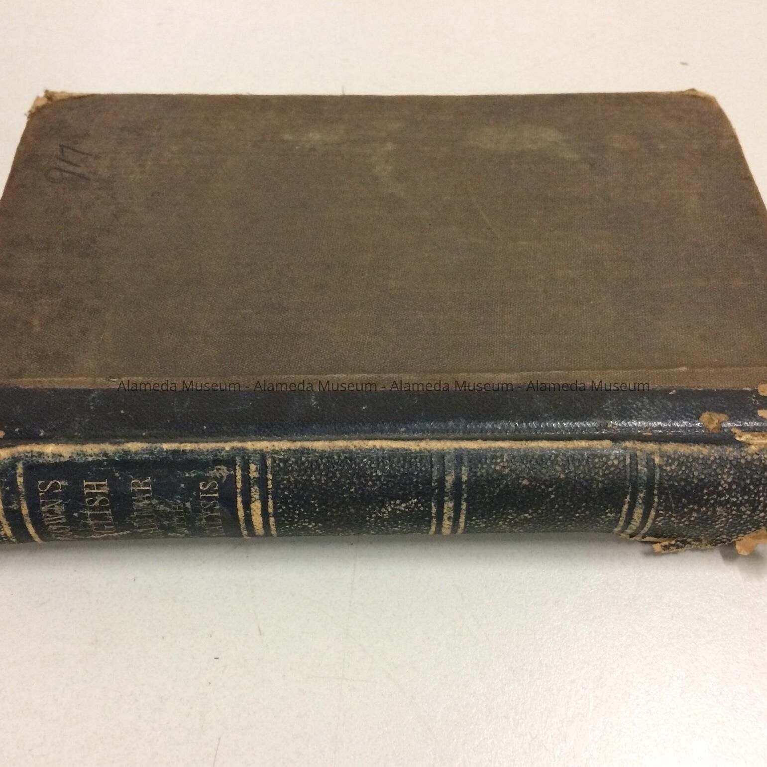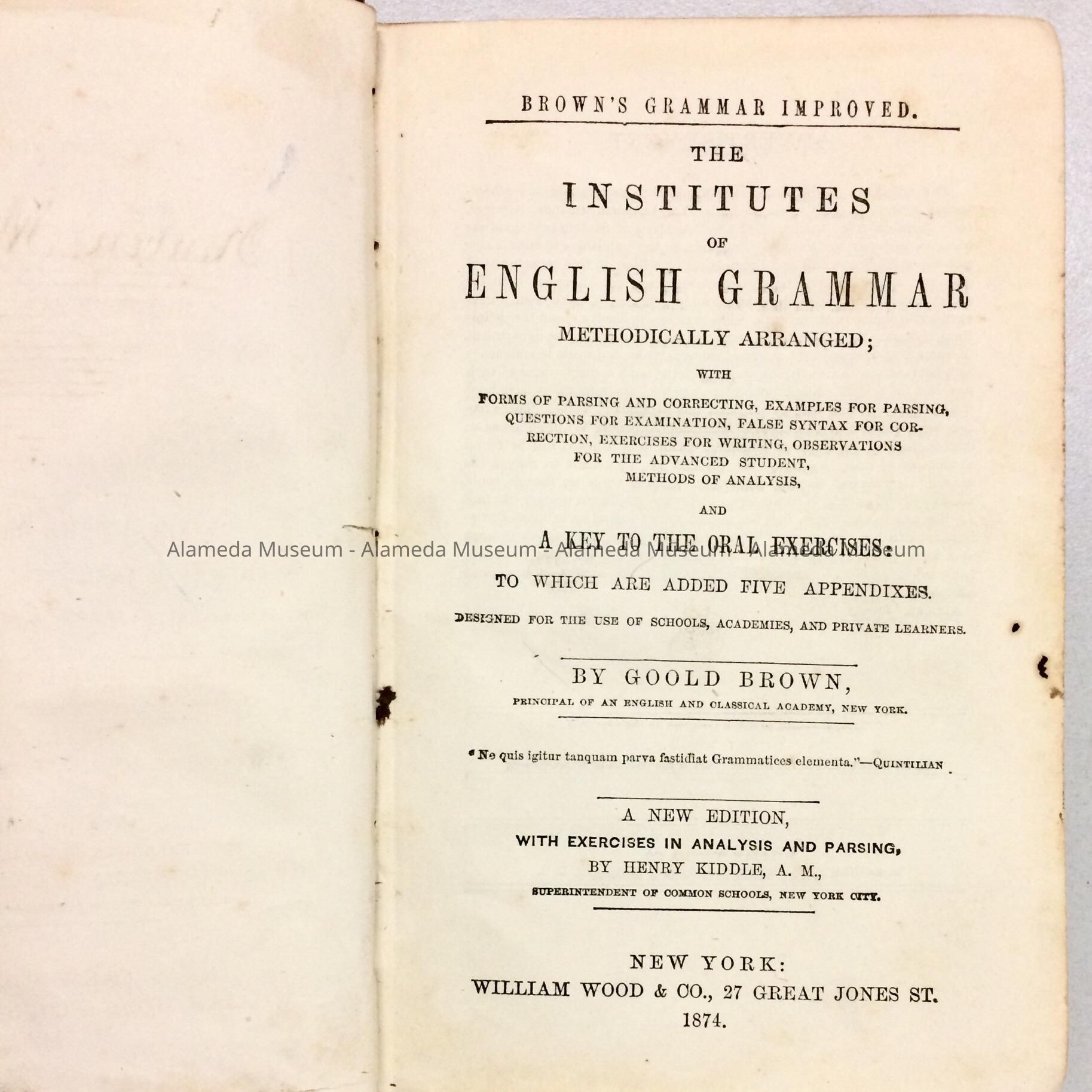 TEXTBOOK ENTITLED, "THE INSTITUTE OF ENGLISH GRAMMAR," BY GOOLD BROWN. THIS PARTICULAR COPY IS INSCRIBED BY MARY AND REUBEN MASTICK, ALAMEDA, CALIFORNIA, JULY 1874. THE MASTICK'S WERE EARLY PROMINENT RESIDENTS OF ALAMEDA. BOOK WAS GIVEN TO THE ALAMEDA HISTORICAL SOCIETY PRIOR TO 1971, AND NUMBERED "917."
