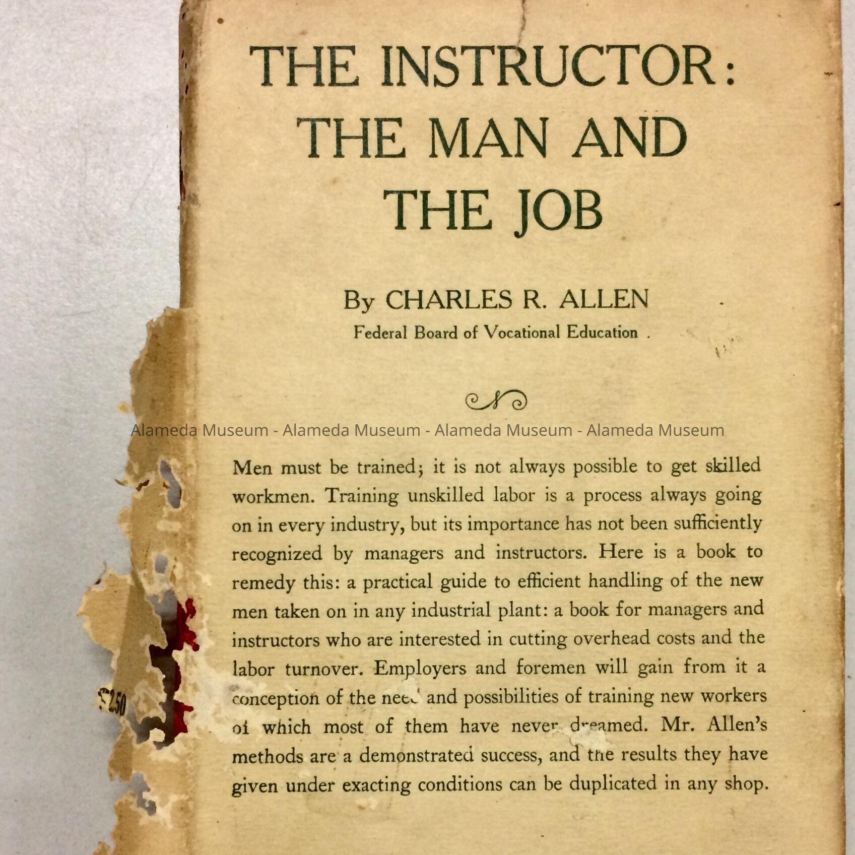 Description: Hard bound book with red-colored buckram cover and original white paper jacket with printed caption "The Instructor, the man and his job" by Charles R. Allen. Copyright 1919, J. B. Lippincott company, 14th impression.