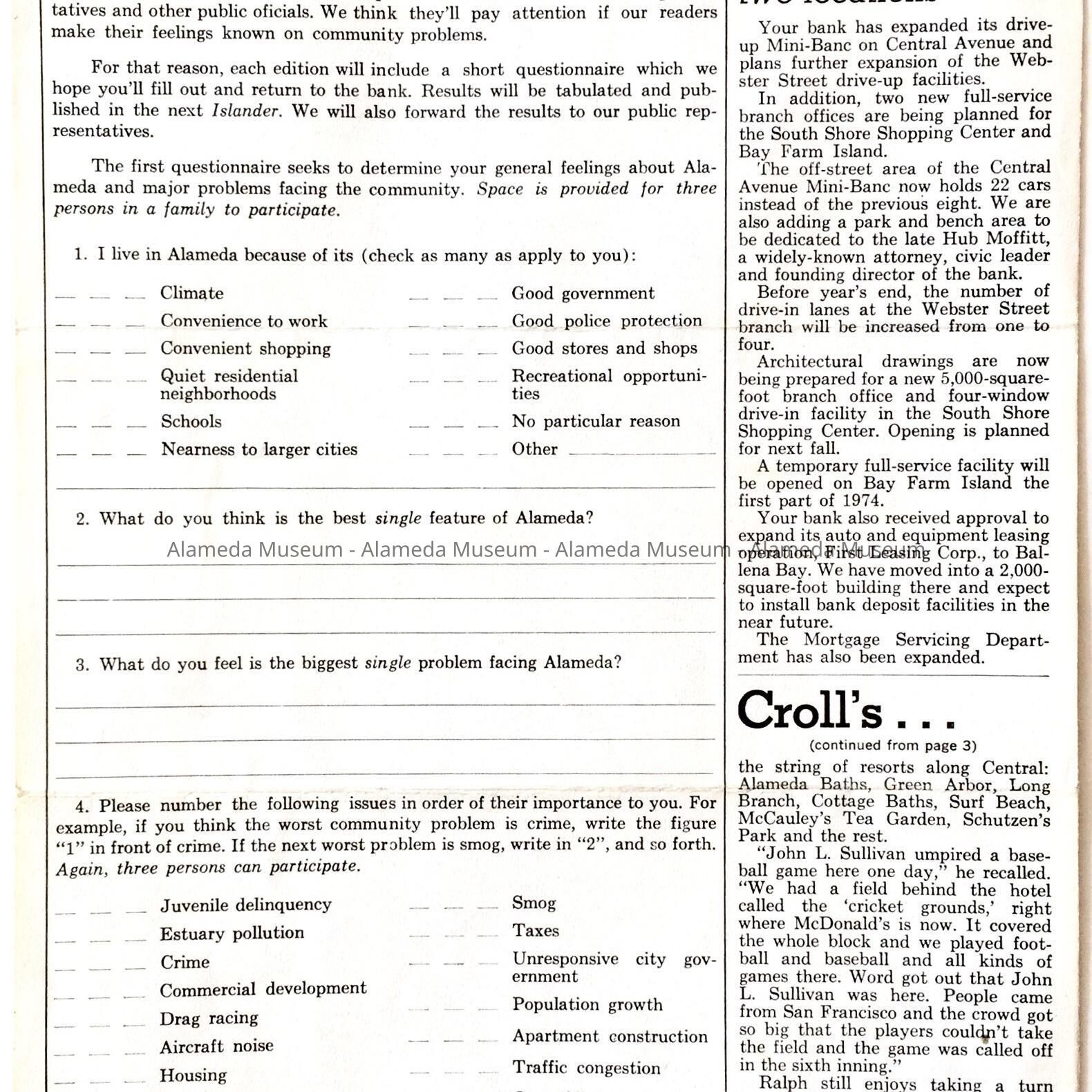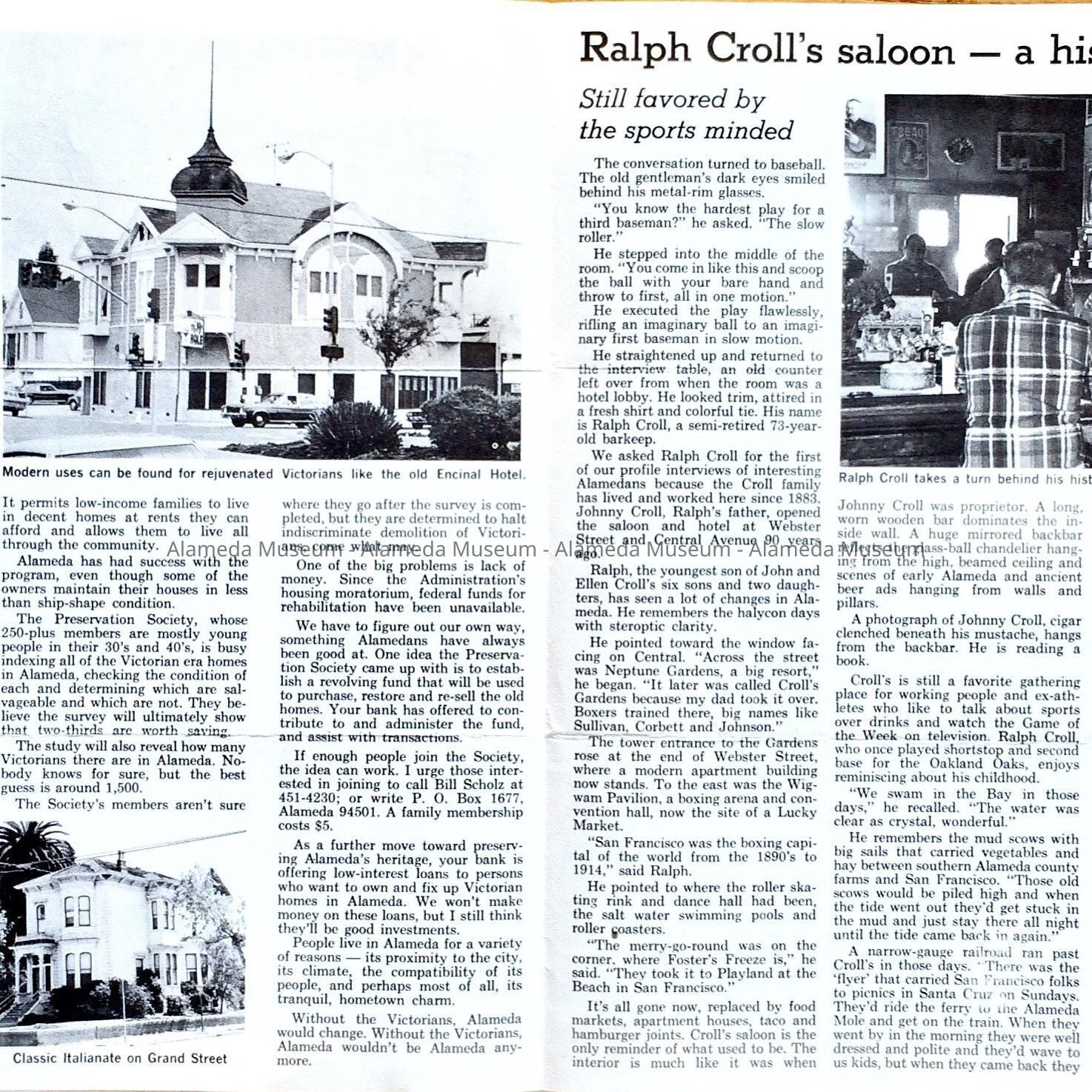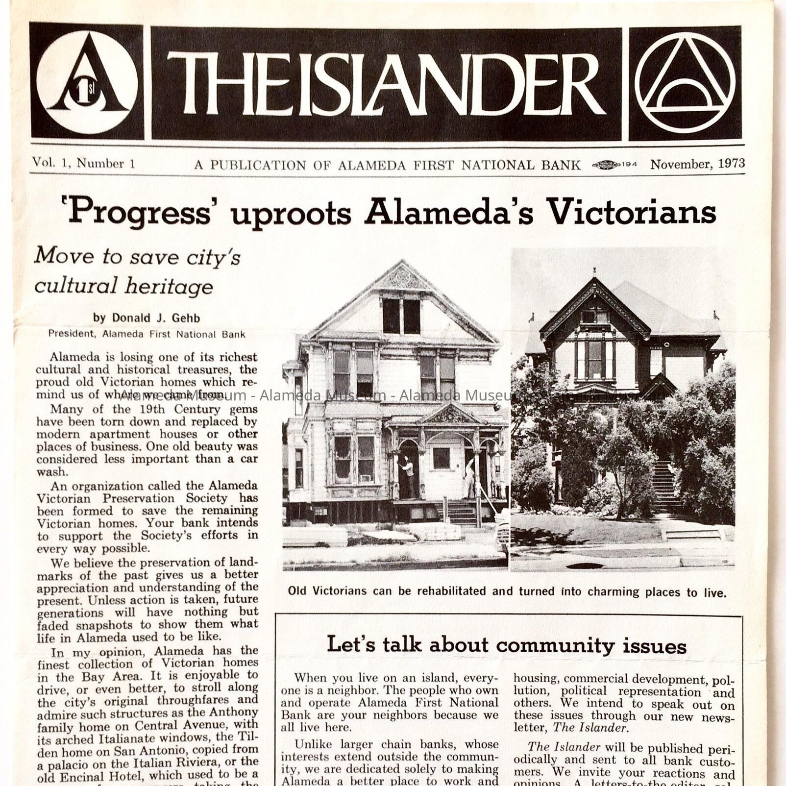 A flyer entitled, "The Islander," a publication of the Alameda First National Bank with an article entitled, "Program Uproots Alameda's Victorians." The article concerns Victorian houses, their preservation, and the Victorian Preservation Society, which was recently founded during the period.