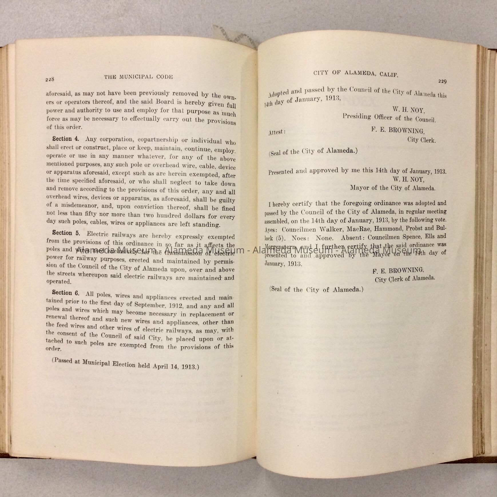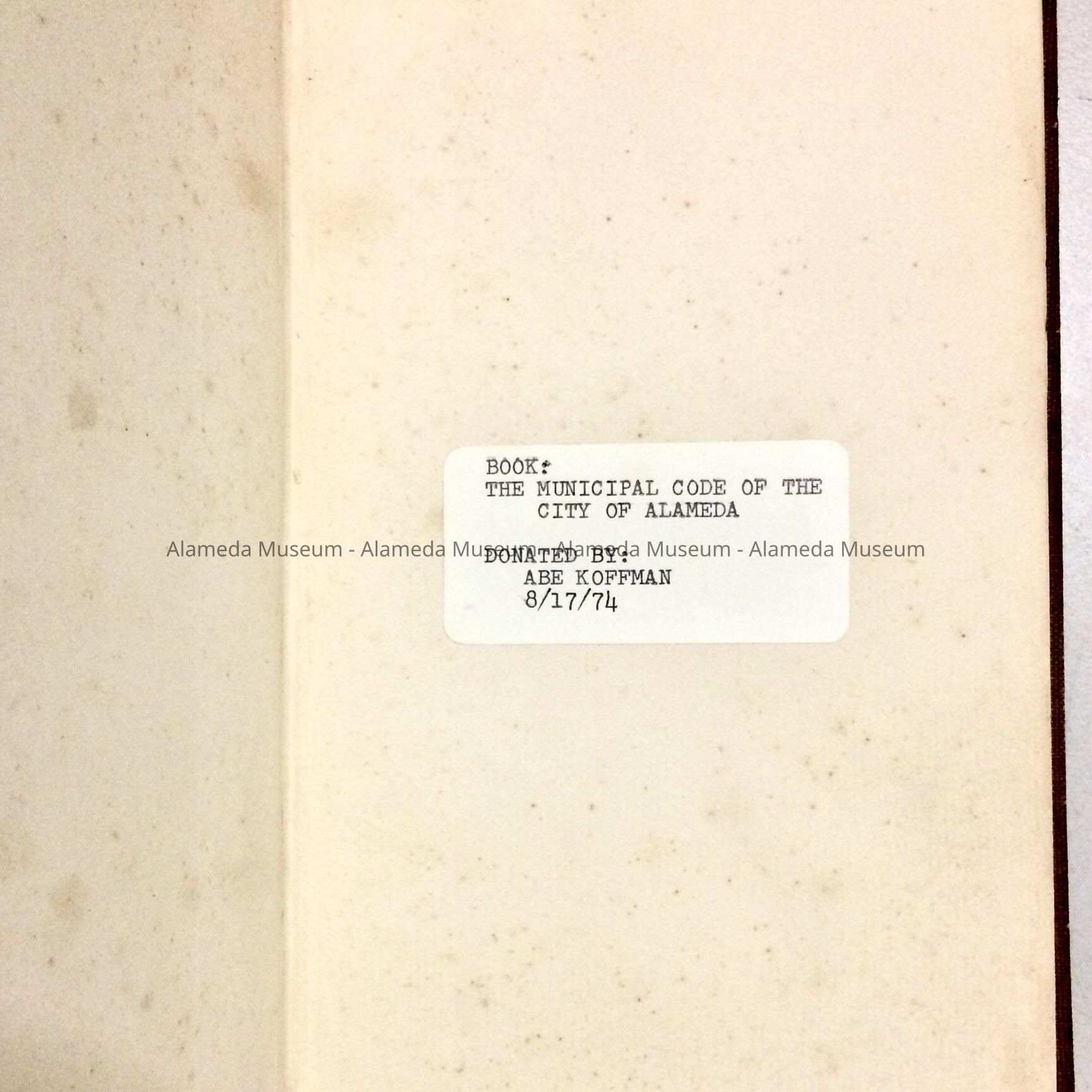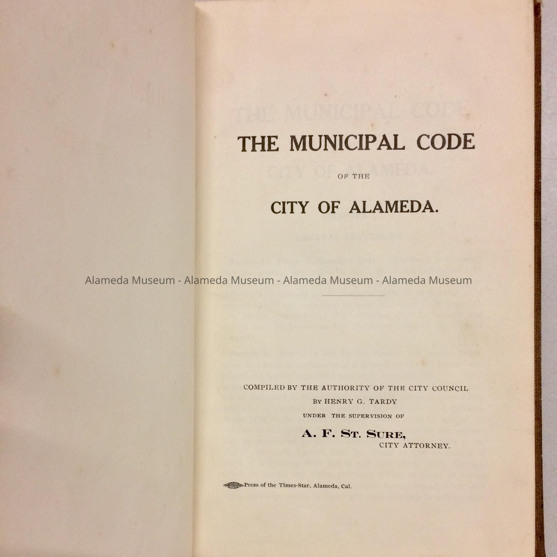 Bound volume containing the Municipal Code of the City of Alameda. This particular copy belonged to the late A.F. St. Sure, City Attorney.