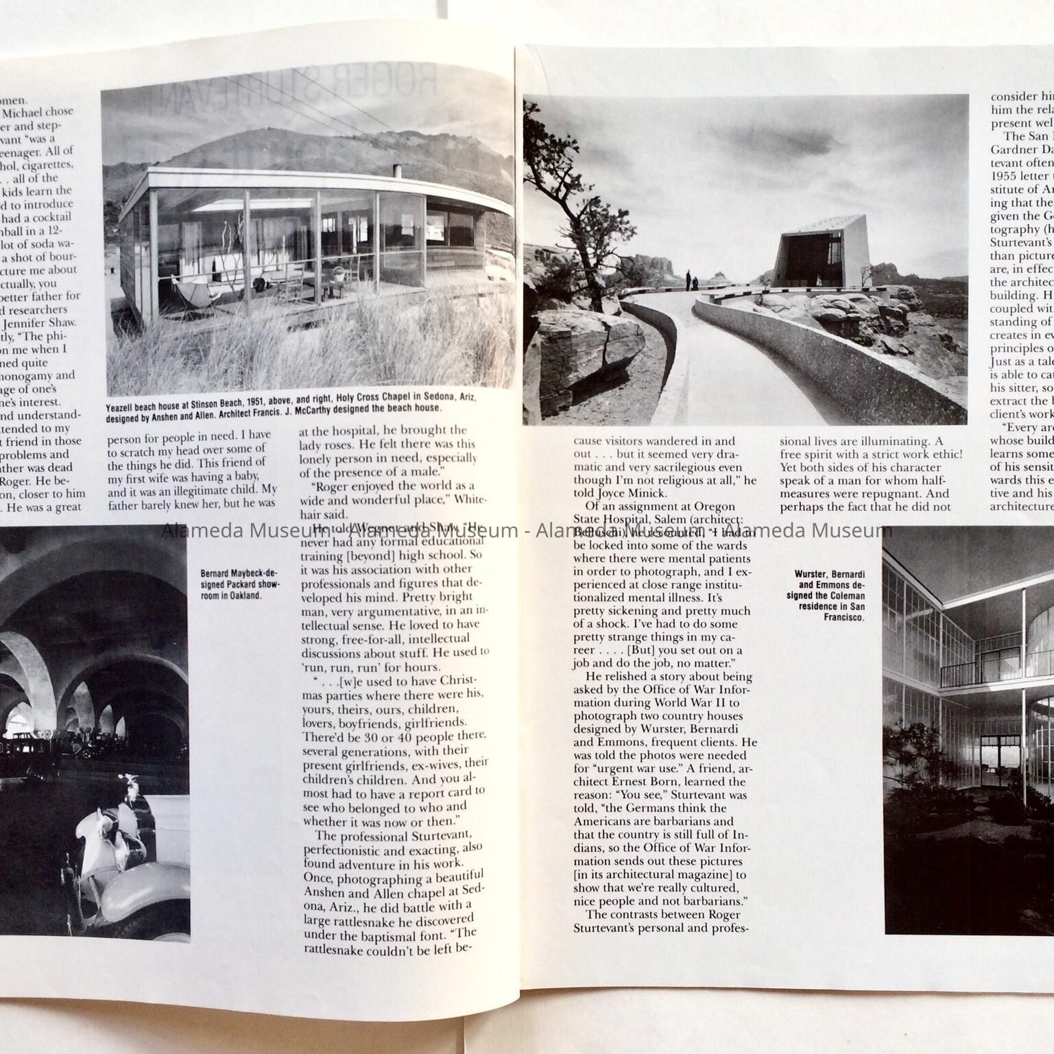 HISTORY OF OBJECT: MAGAZINE COVER HAS AN ILLUSTRATION OF AN OWL IN COLOR. PAGE 13 HAS AN ILLUSTRATED BIOGRAPHICAL SKETCH ENTITLED, "ROGER STURTEVANT, FREE SPIRIT WITH A WORK ETHIC," BY ABBY WASSERMAN. MR. STURTEVANT WAS A NOTED ARCHITECTURAL PHOTOGRAPHER WHO DIED IN 1982 AT THE AGE OF 79. HE WAS BORN AND RAISED IN ALAMEDA, AND WAS A DESCENDANT OF MR. JN WEBSTER, ORIGINAL OWNER OF THE OLDEST DOCUMENTED HOUSE IN ALAMEDA AT 1238 VERSAILLES STREET.