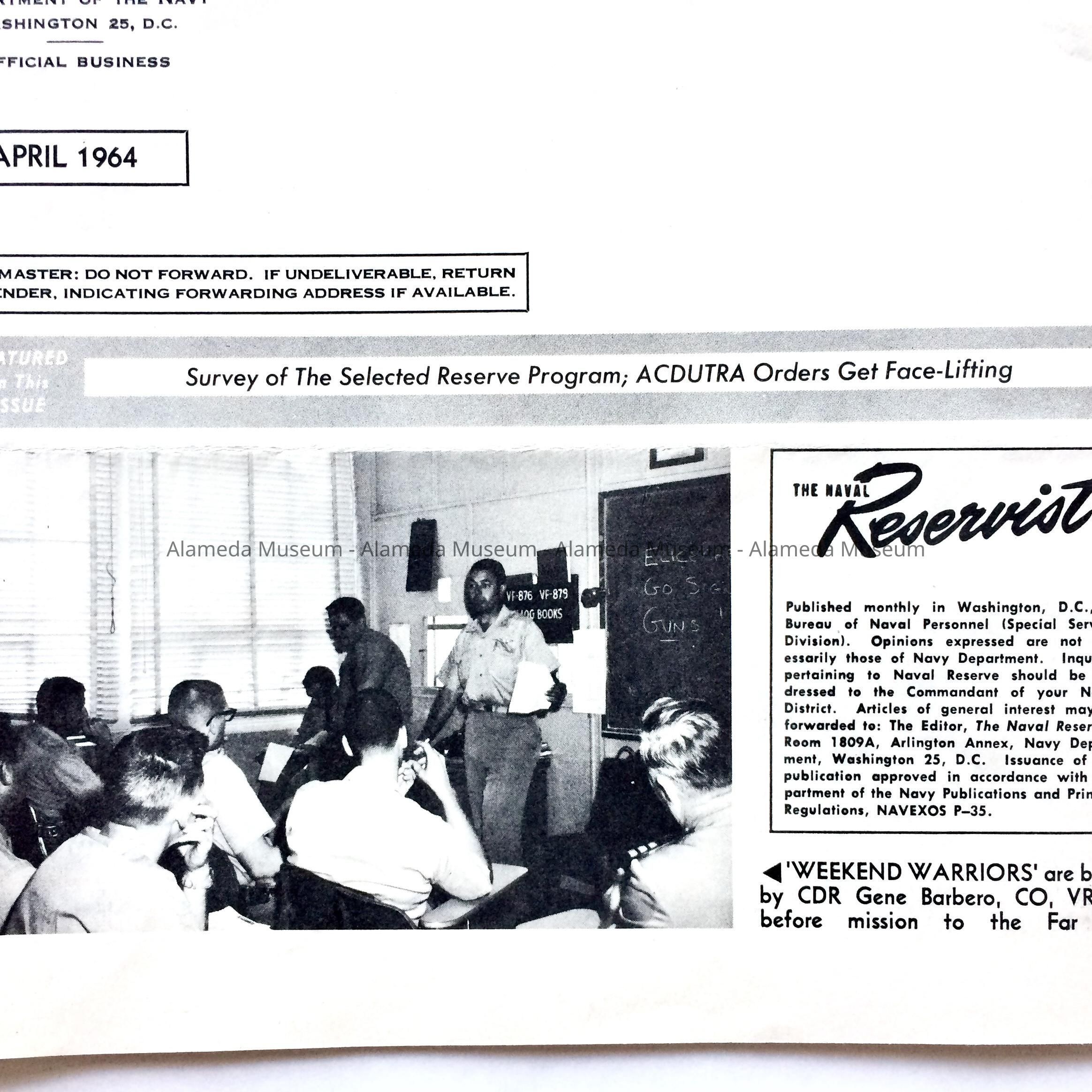 History of Object: This magazine contains photos on pp. 4 and 8 of activities of the U.S. Naval Air Reserve Unit VR-872 based at the NAS, Alameda. This was part of the Naval Air Reserve memorabilia belonging to the late Mary Seebach of Oakland, a 20-year member.