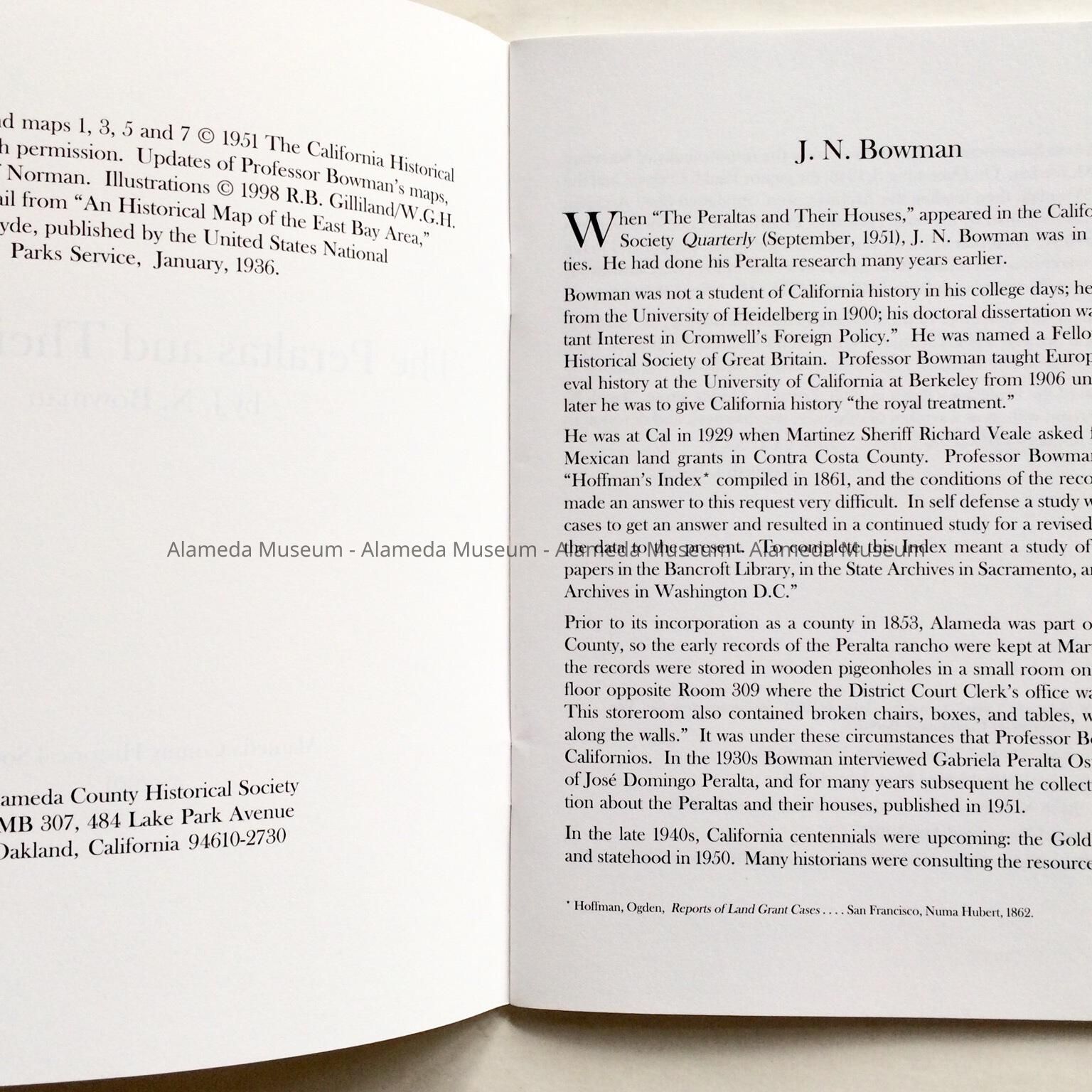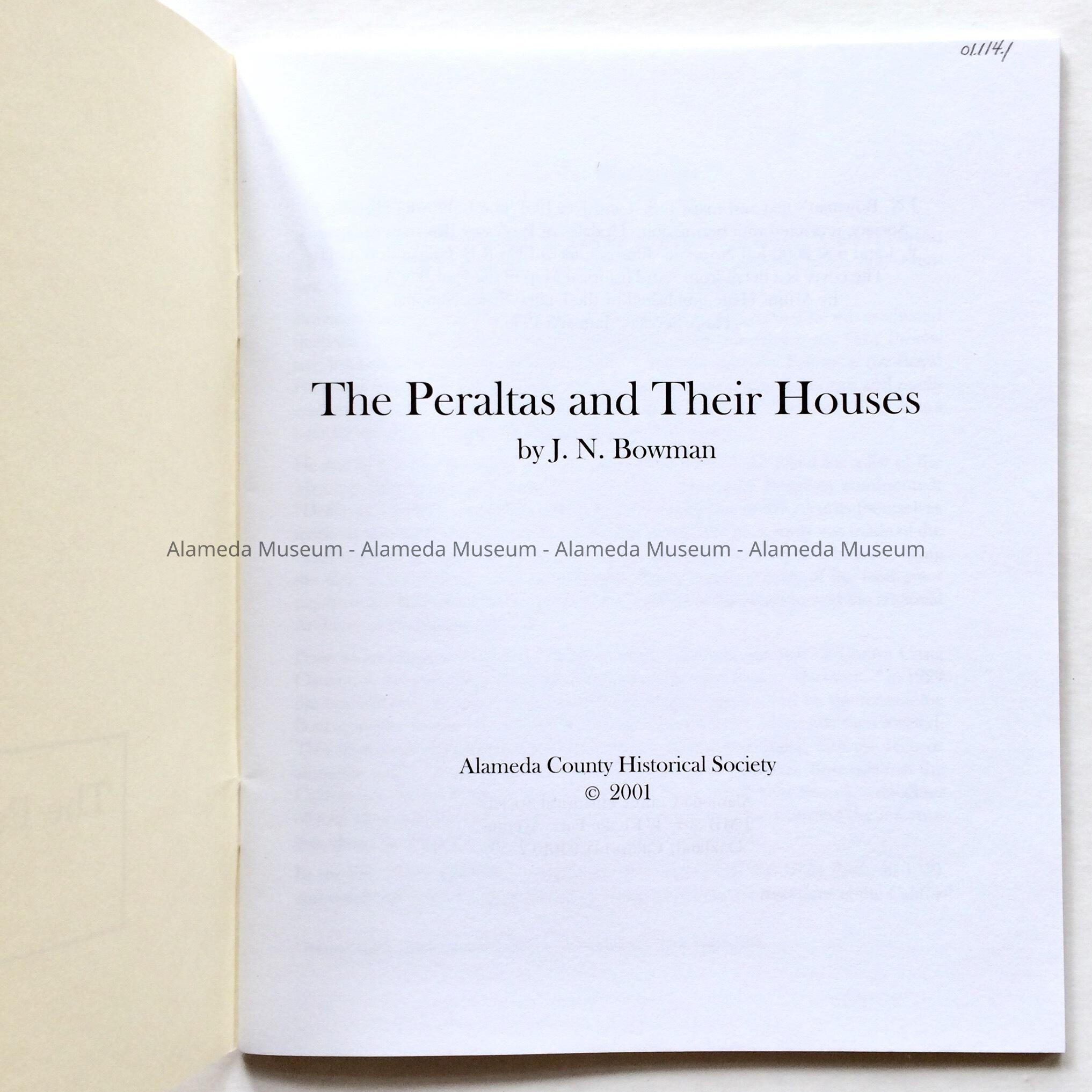 Booklet entitled, “The Peraltas and Their Houses”, by J. N. Bowman, printed by the Alameda County Historical Society and copyrighted 2001. Booklet concerns the sites of various homes occupied by the Peralta family, original owners of the property now known as the City of Alameda.