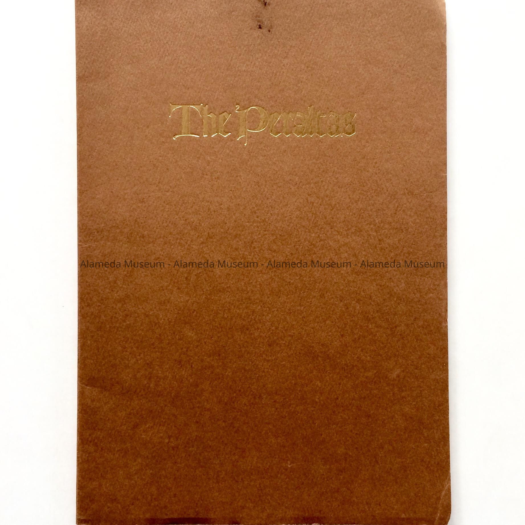 Description: Soft-bound booklet with cover of brown-colored stock paper. Cover has an incised caption, "The Peraltas" in gold-colored type.