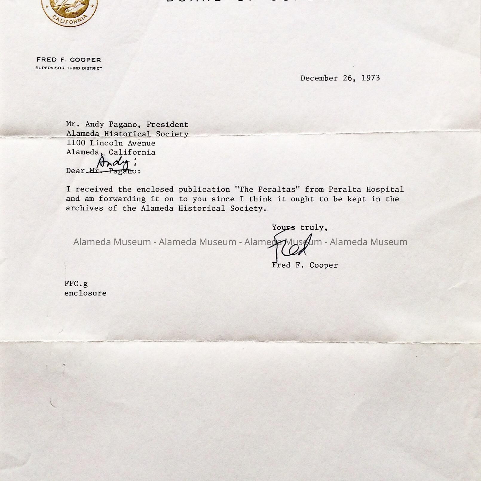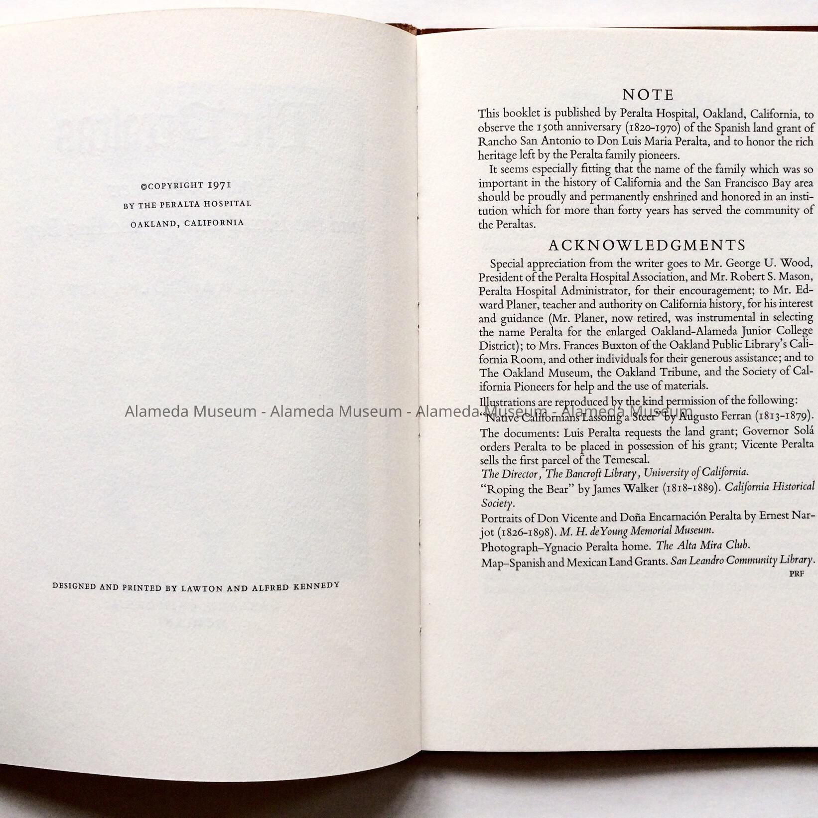 History: Booklet titled "The Peraltas," by Pearl Randolph Fibel, published by the Peralta Hospital, Oakland, and copyrighted 1971. The booklet tells of the Peralta family who once owned a great portion of the East Bay, including Oakland and Alameda. Illustrated with photographs of their surviving homes and brands used on their livestock.