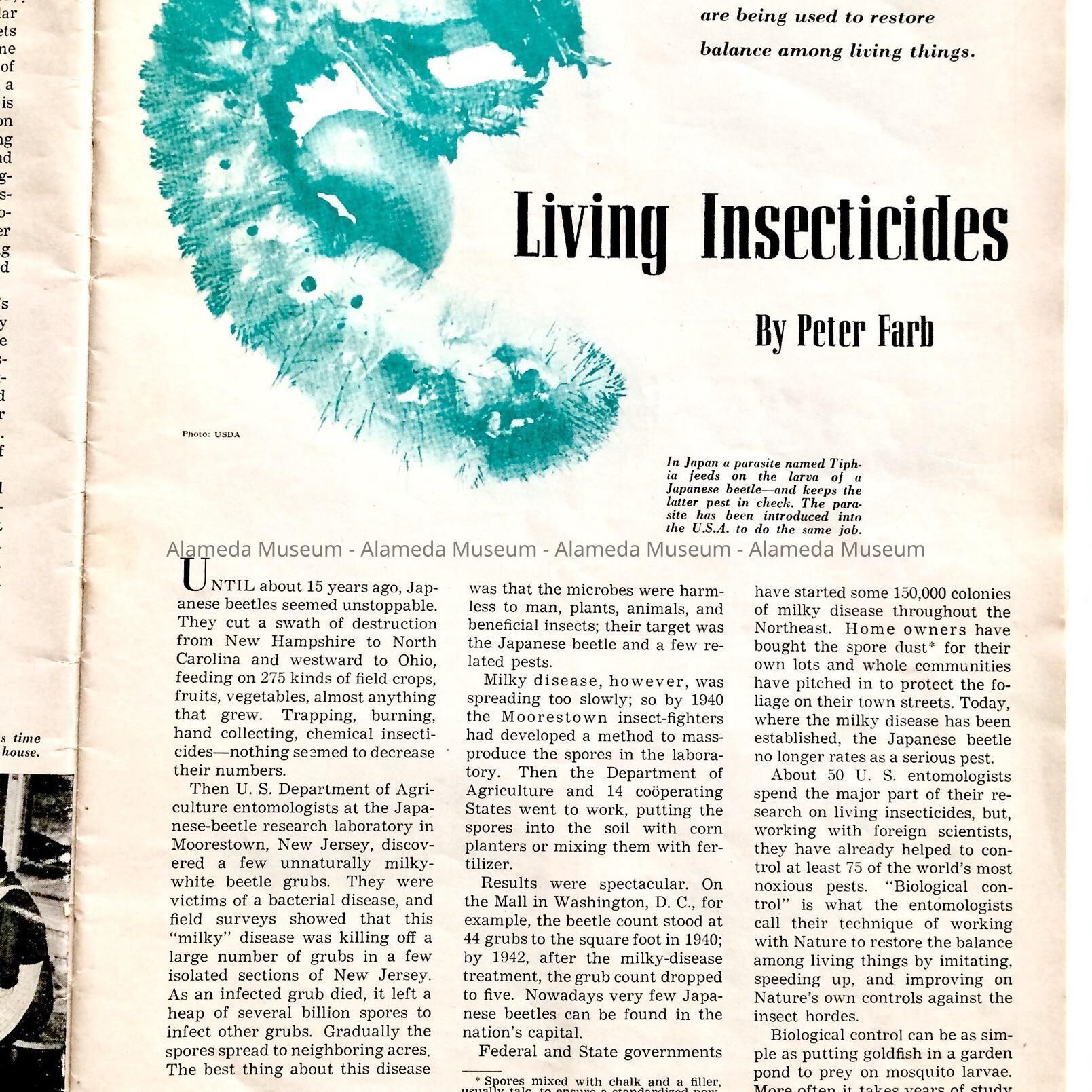 Magazine entitled, “The Rotarian”, for April 1957. Page 21 has an article entitled, "Living Insecticides”, which includes information on the noted Entomologist, Albert Koebele, one-time resident of Alameda.