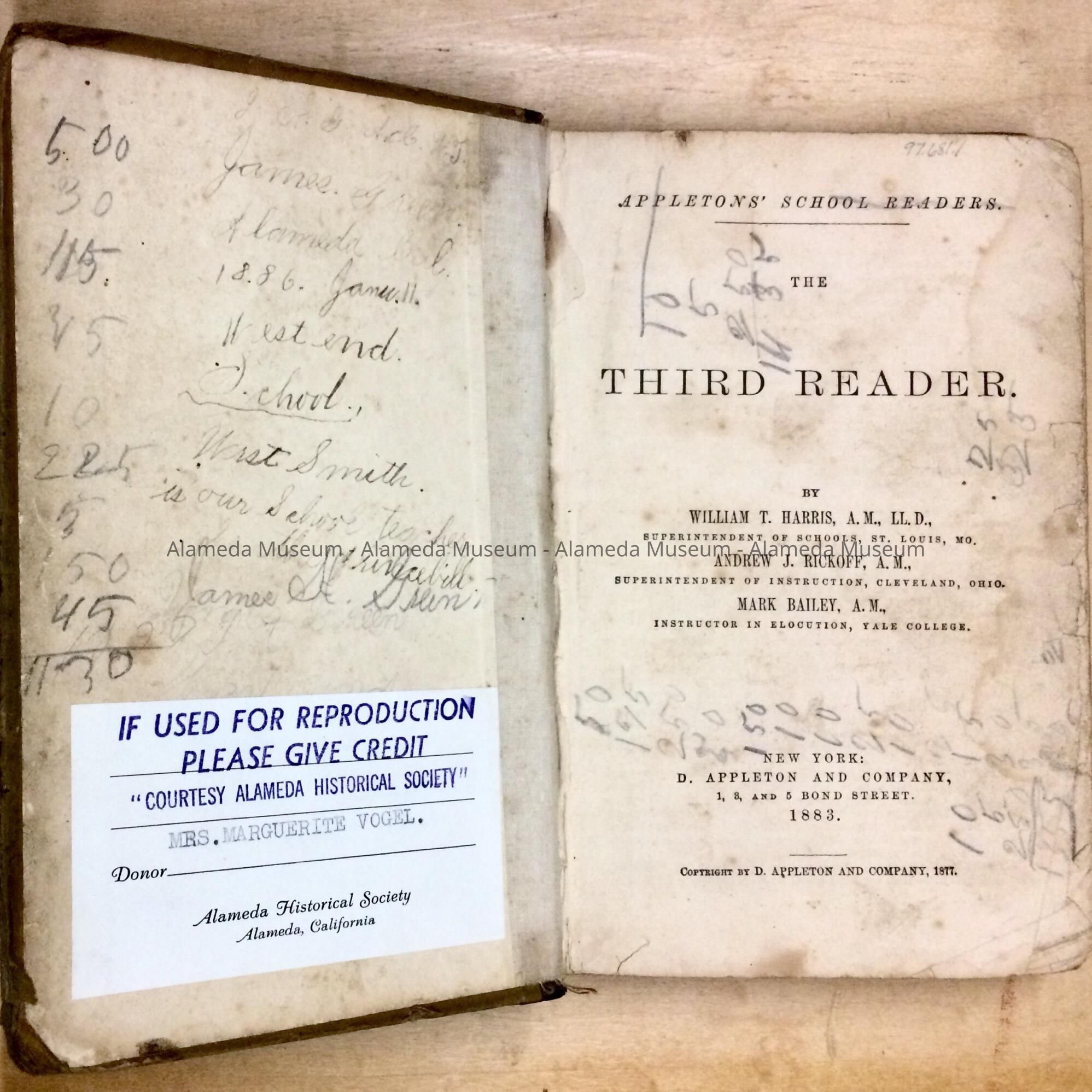 HISTORY OF OBJECT: APPLETON'S SCHOOL READER ENTITLED, "THE THIRD READER," AND INSCRIBED " JAMES GREEN, ALAMEDA, CALIFORNIA, JANUARY 11, 1886, WEST END SCHOOL." PREDECESSOR OF LONGFELLOW SCHOOL. BOOK WAS GIVEN TO THE ALAMEDA HISTORICAL SOCIETY PRIOR TO 1971, NUMBERED "912," AND NOT OFFICIALLY CATALOGED AT THAT TIME.