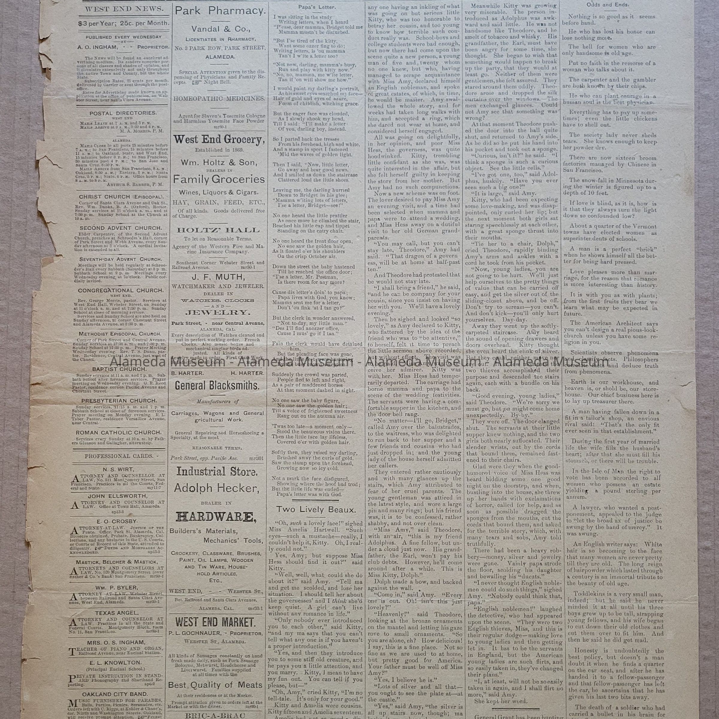 History of Object: This newspaper was published every Wednesday. A. O. Ingham was the proprietor and the office was on Webster Street, near Santa Clara Avenue. Sometime, between this issue and September 5th, this paper would be renamed Alameda Semi-Weekly News and published twice a week.