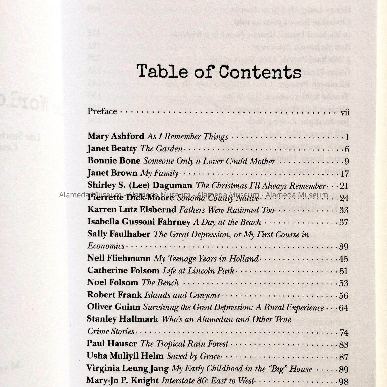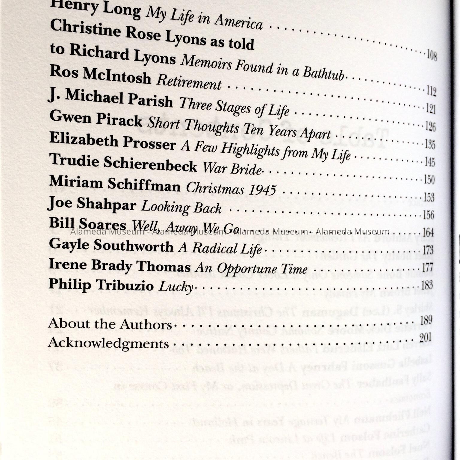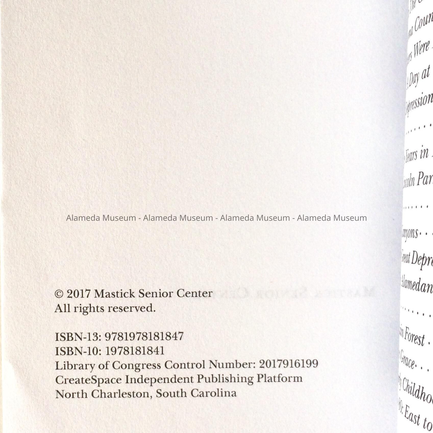 History of Object: Book with stories about the lives of 32 members of the Mastick Senior Center, including childhood recollections, war and travel tales, stories and poems. The book appears to be the result of a creative writing class given at the Mastick Center, but various of the stories reflect childhood stories of growing up in Alameda, or how the author came to Alameda from elsewhere.