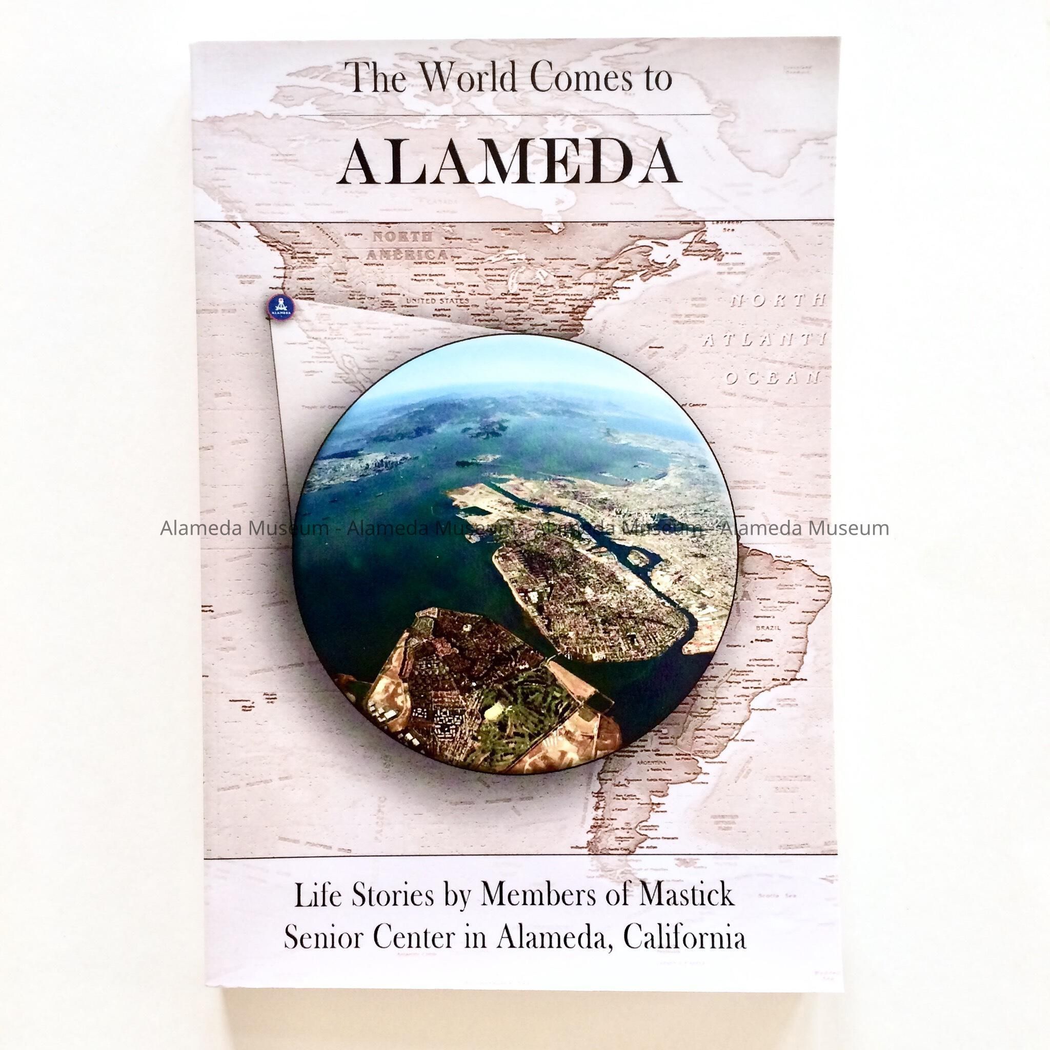 Description: softbound book with glossy card stock paper cover, featuring a monochromatic map of the Americas with a circular pop-out aerial color-view of Alameda. Title 'The World Comes to Alameda', subtitle, 'Life Stories by Members of Mastick Senior Center in Alameda, California. Authors, various, ISBN 9781978181847.