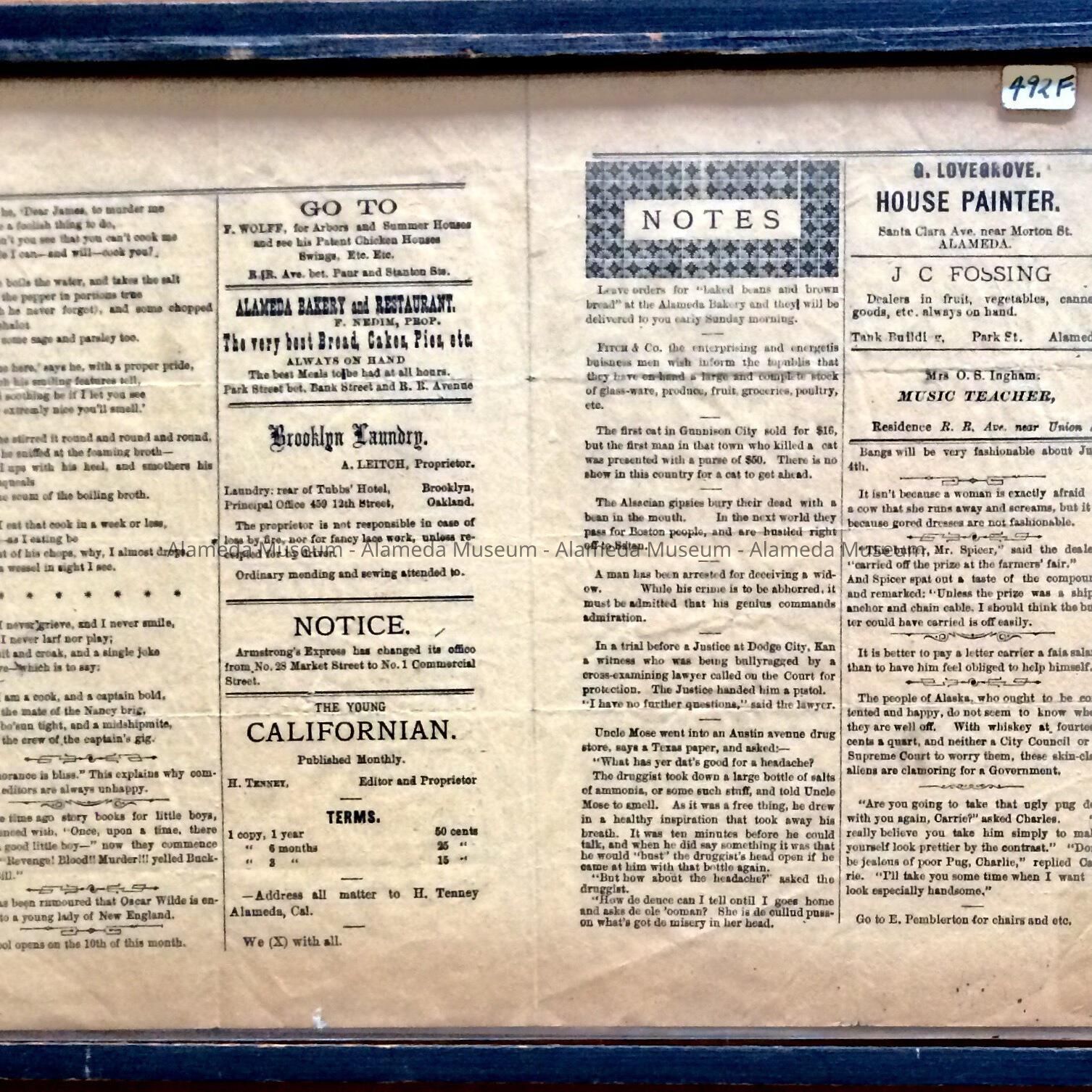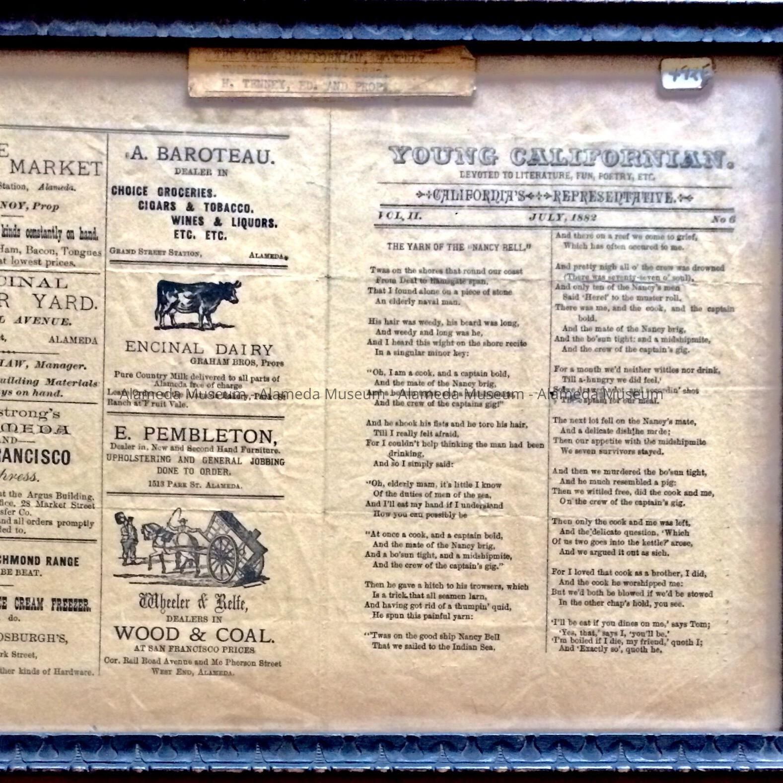 The Young Californian, Devoted to Literature, Fun, Poetry, etc., a monthly publication, dated July, 1882. H. Tenney, editor and proprietor. Possibly printed in Alameda as it has many advertisements for Alameda businesses.