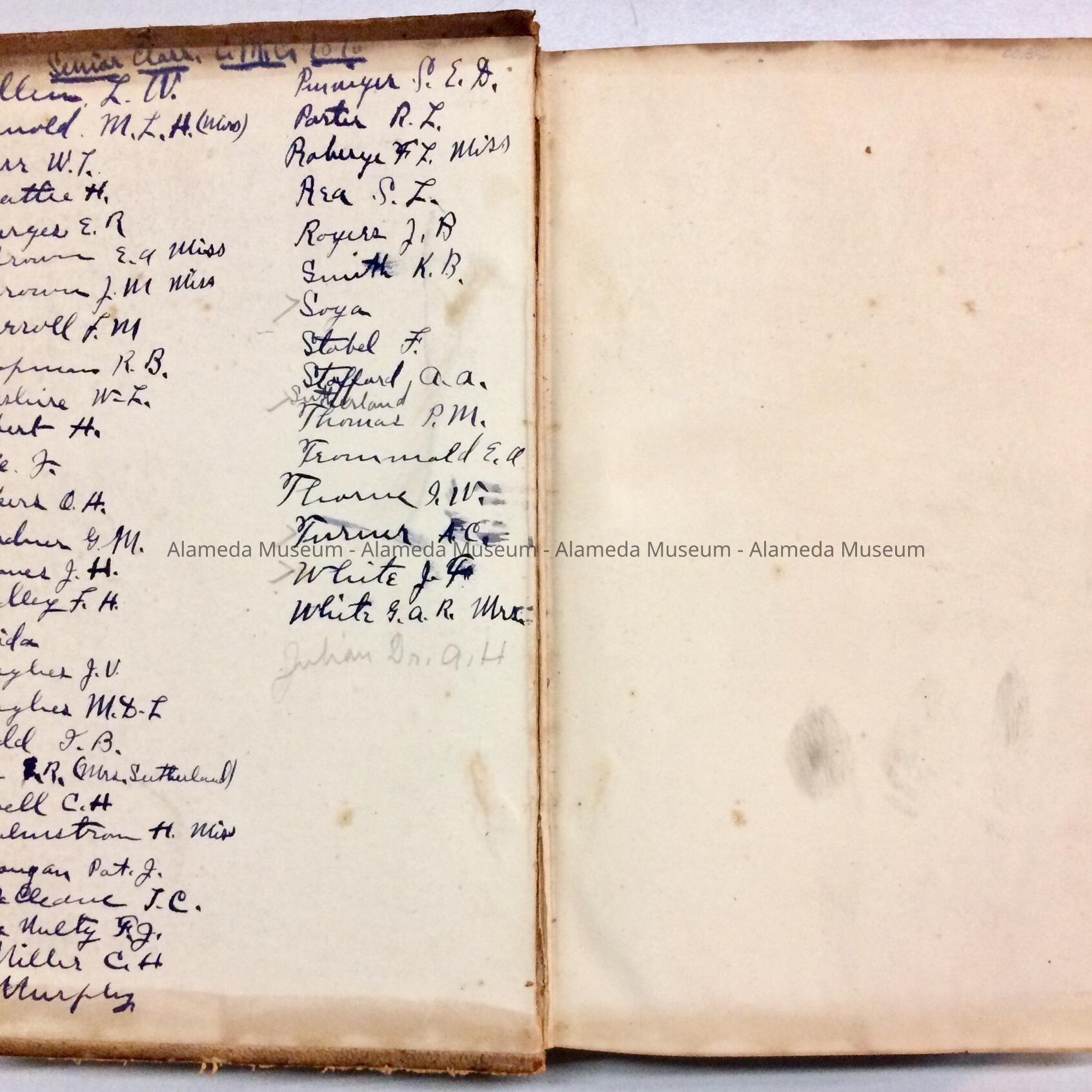 History: Personal medical reference book belonging to the late Dr. A.A. Stafford, prominent early Alameda physician. On the interior top cover is written a list of names of the senior class members who graduated with Dr. Stafford in 1876 from an unknown medical school.