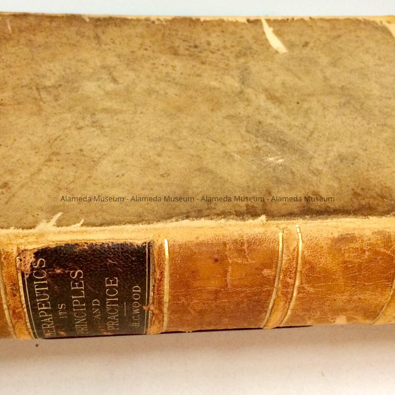 Description: Hard bound book covered in brown colored leather. Spine of book has caption in gold colored type "Therapeutics, Its Principles and Practice" by H.C. Wood, in dark brown colored leather on a tan colored background. J.B. Lippincott & Company, Philadelphia, 1891.