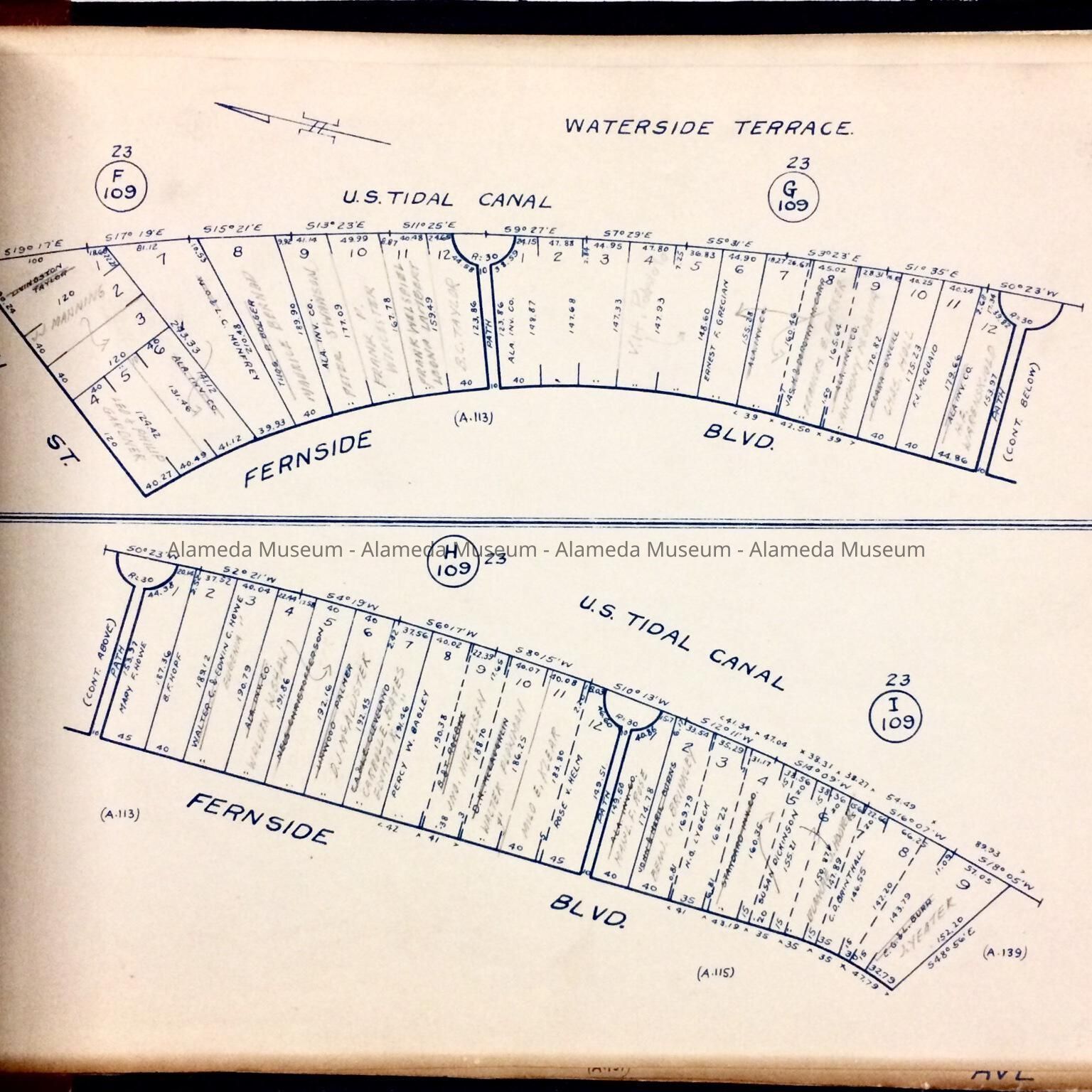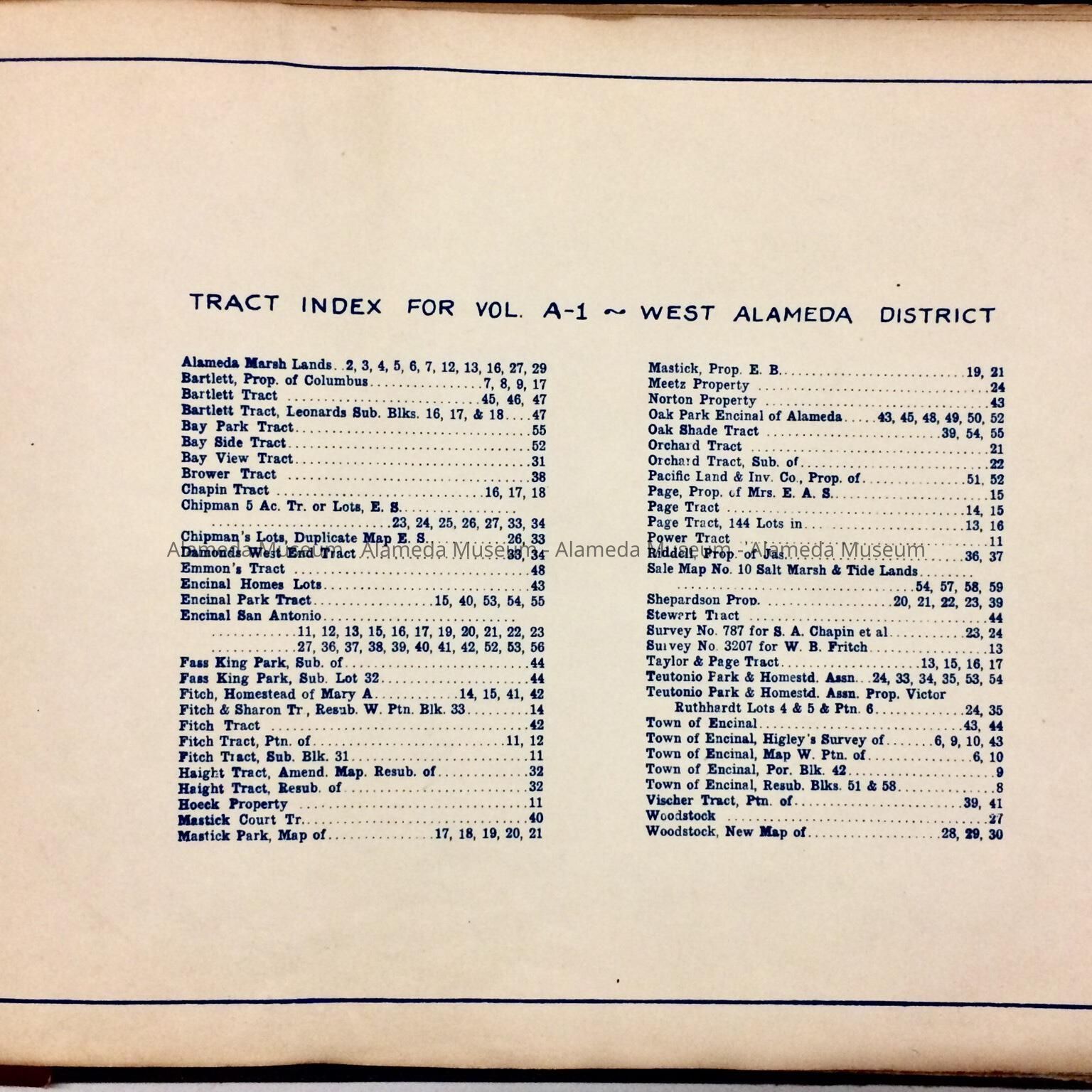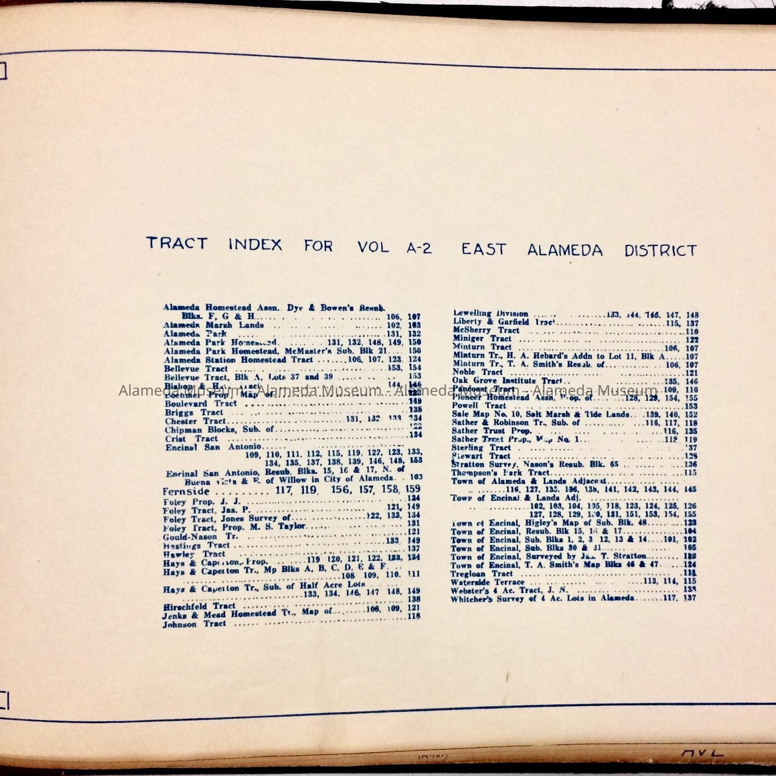 History of Object: A block book that includes maps and type printed in blue and other colors. It includes property in the east end of Alameda plus marshlands in the west end from Chestnut Street to Main Street.