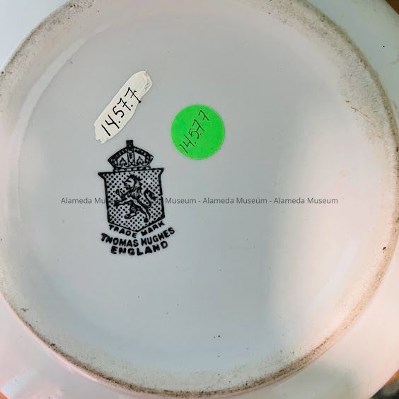 Description: A chamber pot, semi porcelain, resembling ironstone. Its base has a potter's mark: "Thomas Hughes, England" with a pseudo heraldic shield featuring a lion rampant above which is a crown.