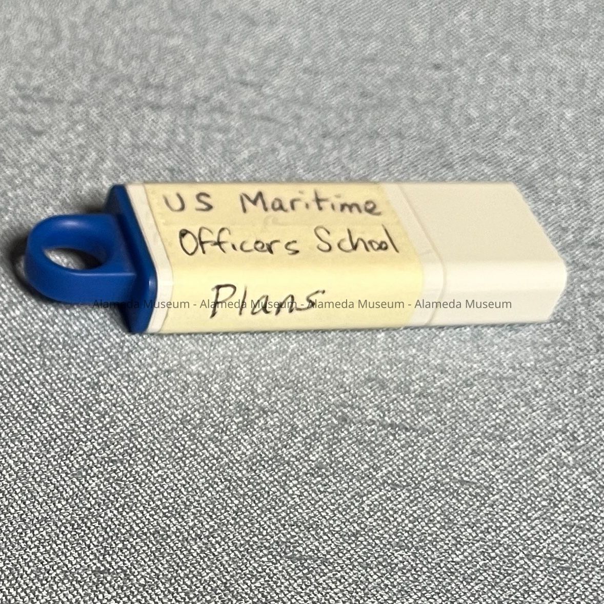Description: white plastic and metal digital data thumb drive, with blue key-ring. Handwritten label states: U.S. Maritime Officers School Plans.