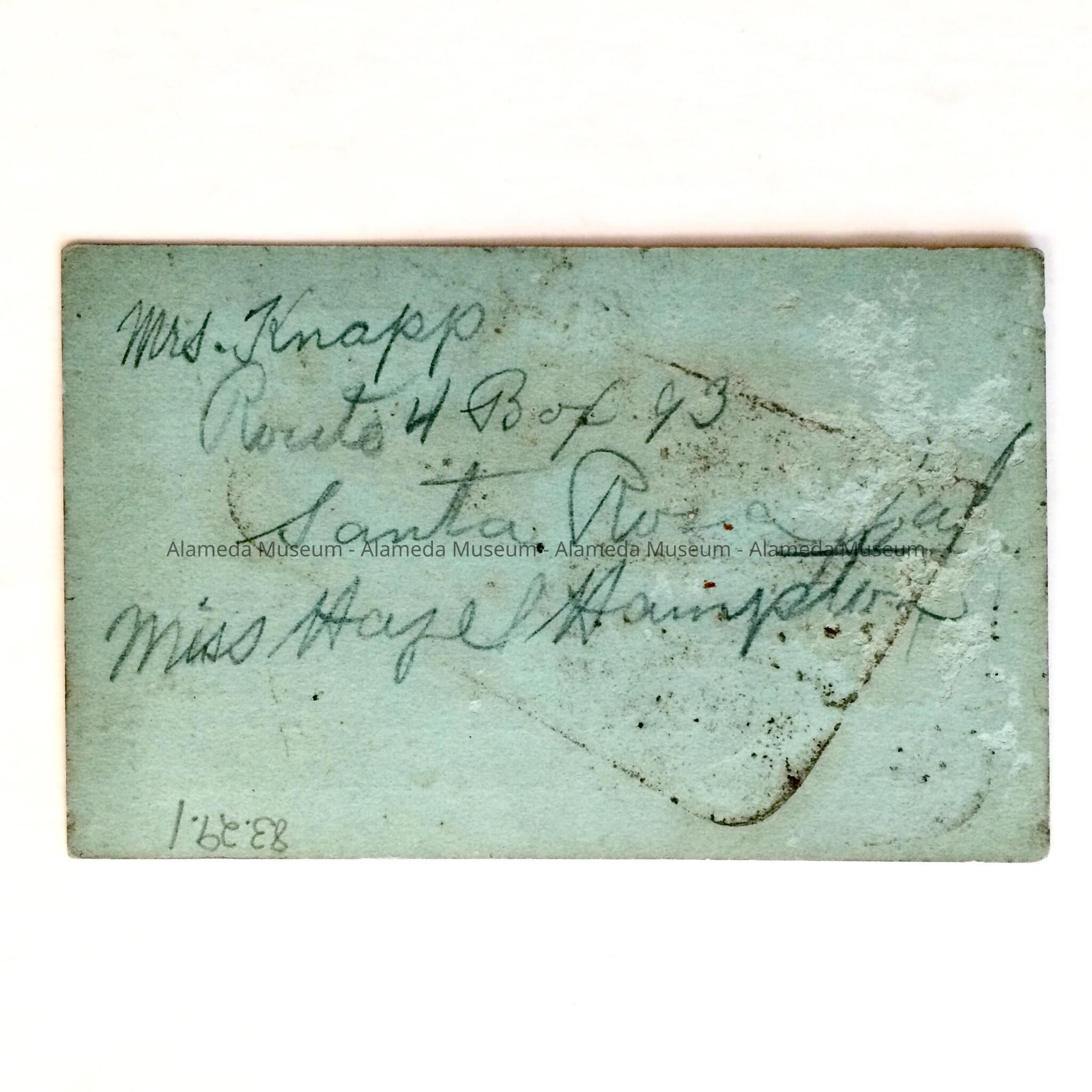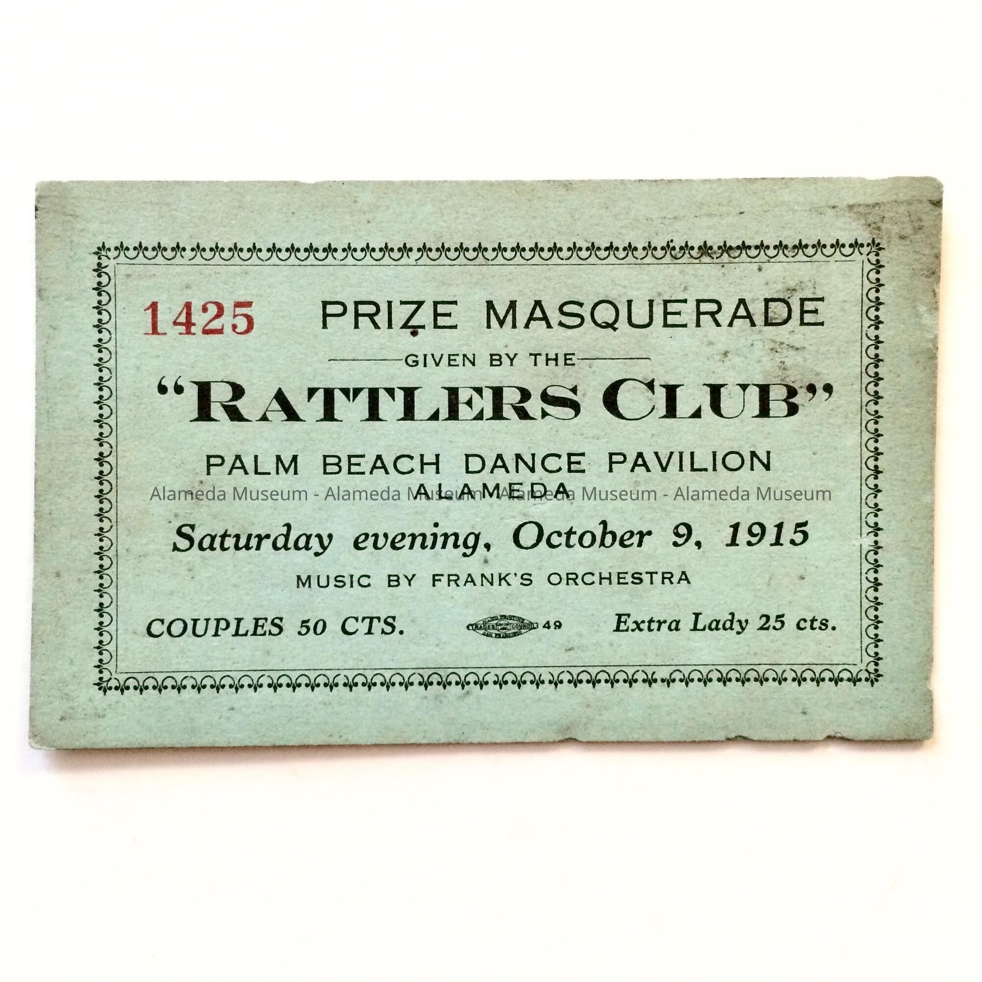 History of Object: Ticket, prize masquerade, given by the "Rattlers Club", Palm Beach Dance Pavilion, Alameda, Saturday evening, October 9, 1915. This ticket was found in the attic of 883 Cedar St., Alameda, by the donor.
