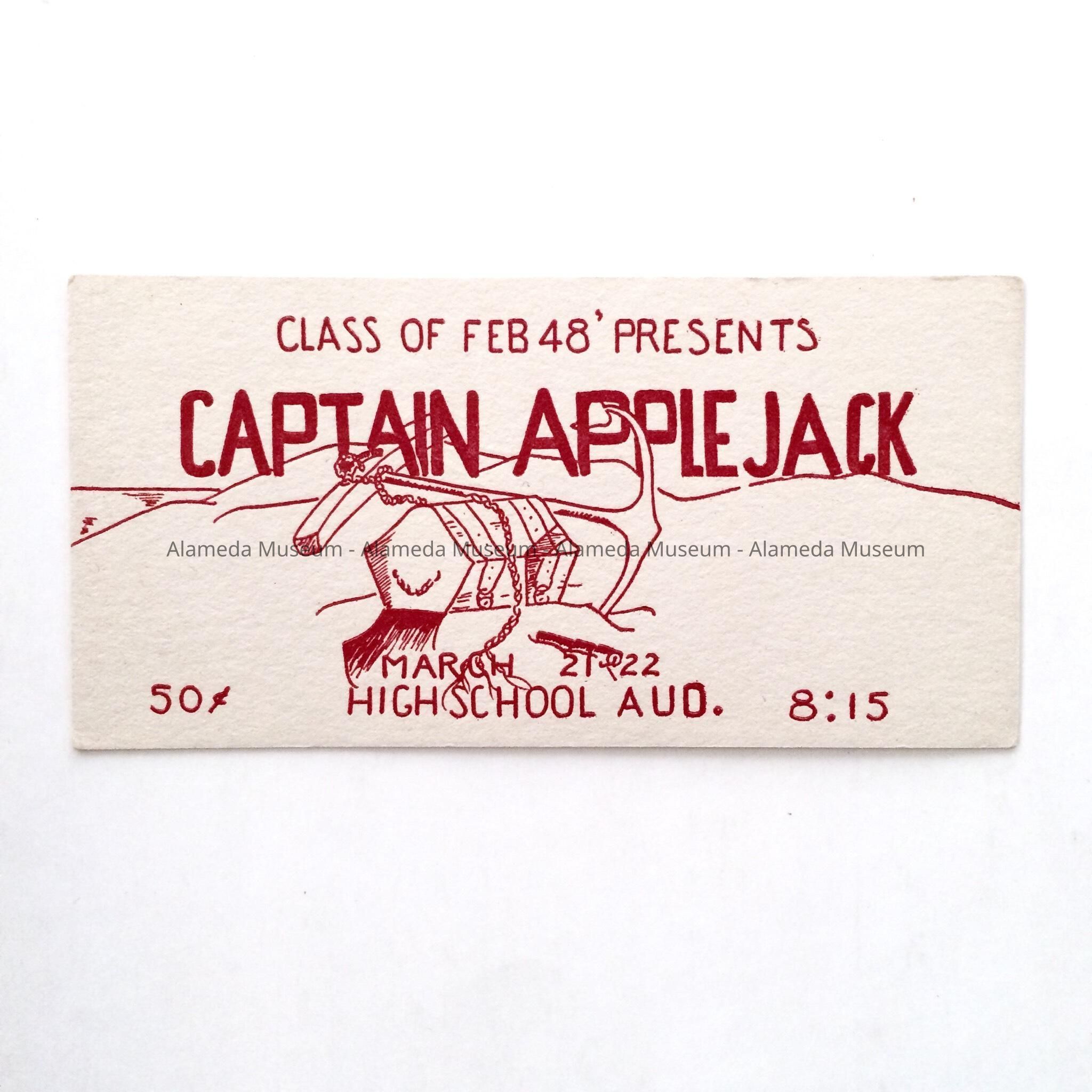 History of Object: Ticket to the class of 1948-Alameda High School production "Captain Applejack," High School auditorium, March 21 & 22.
