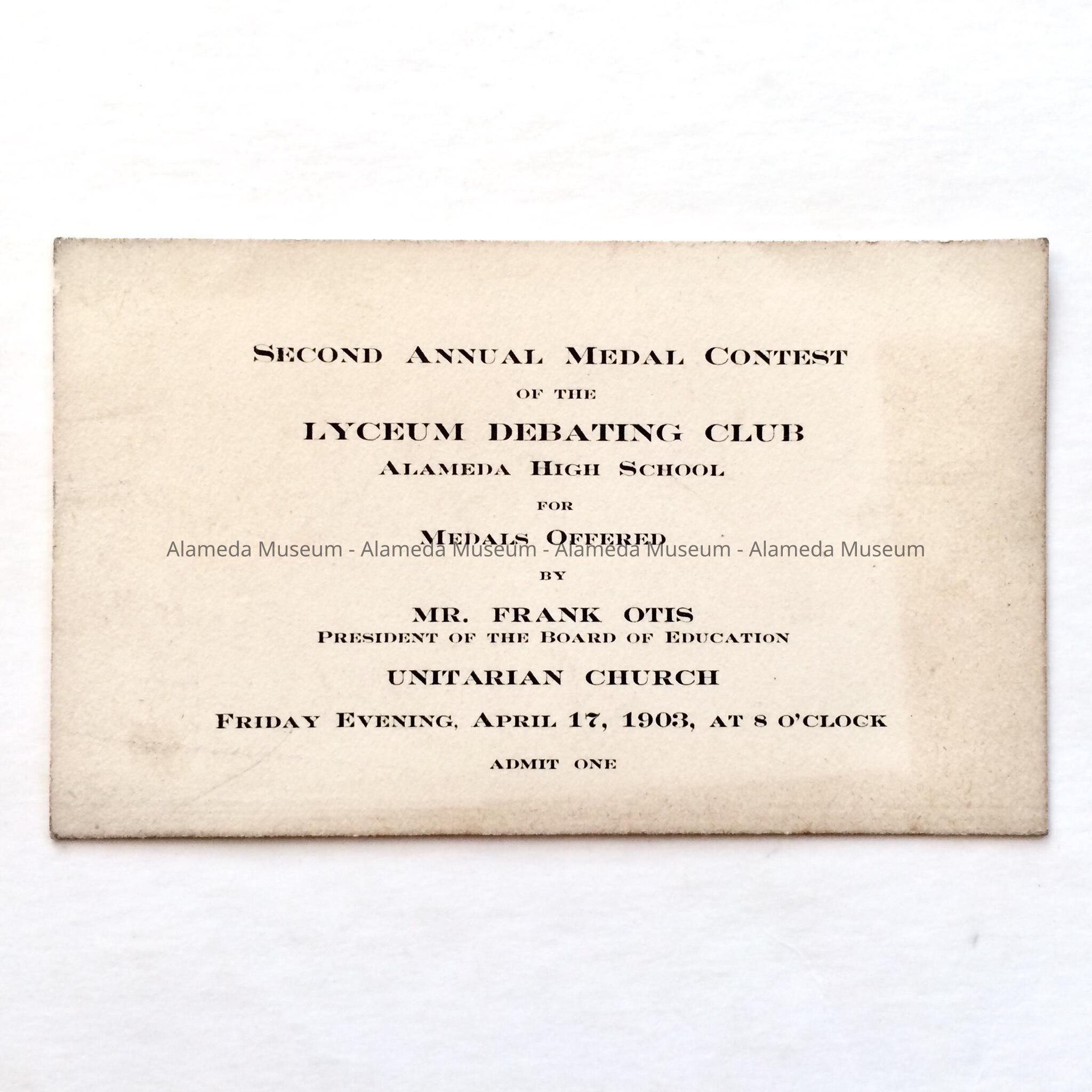 Ticket to Alameda High School Debating Club, Unitarian Church, 1903Entry/Object ID