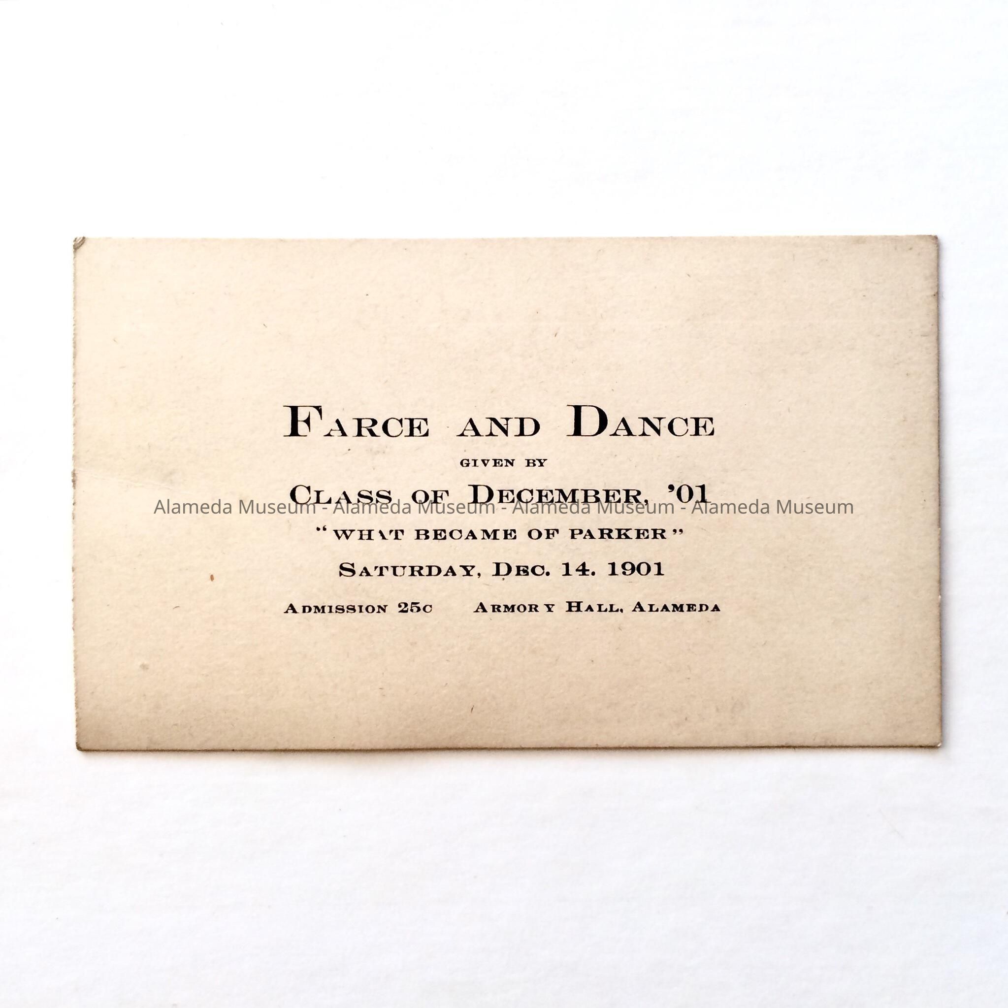 ADMISSION TICKET TO THE "FARCE AND DANCE," PRESENTED ON DECEMBER 14, 1901, BY THE CLASS OF DECEMBER 1901, AT ARMORY HALL, ALAMEDA, CALIFORNIA. PRICE: $0.25.