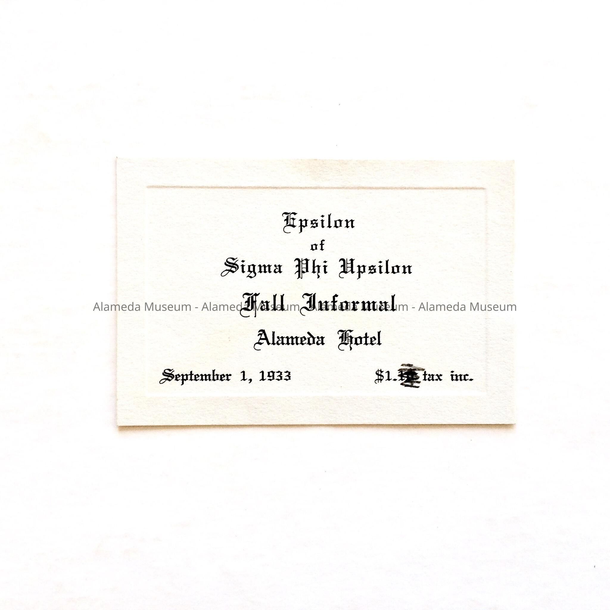 A TICKET TO A DANCE HELD BY THE EPSILON OF SIGMA PHI UPSILON OF THE ALAMEDA HIGH SCHOOL IN 1930.