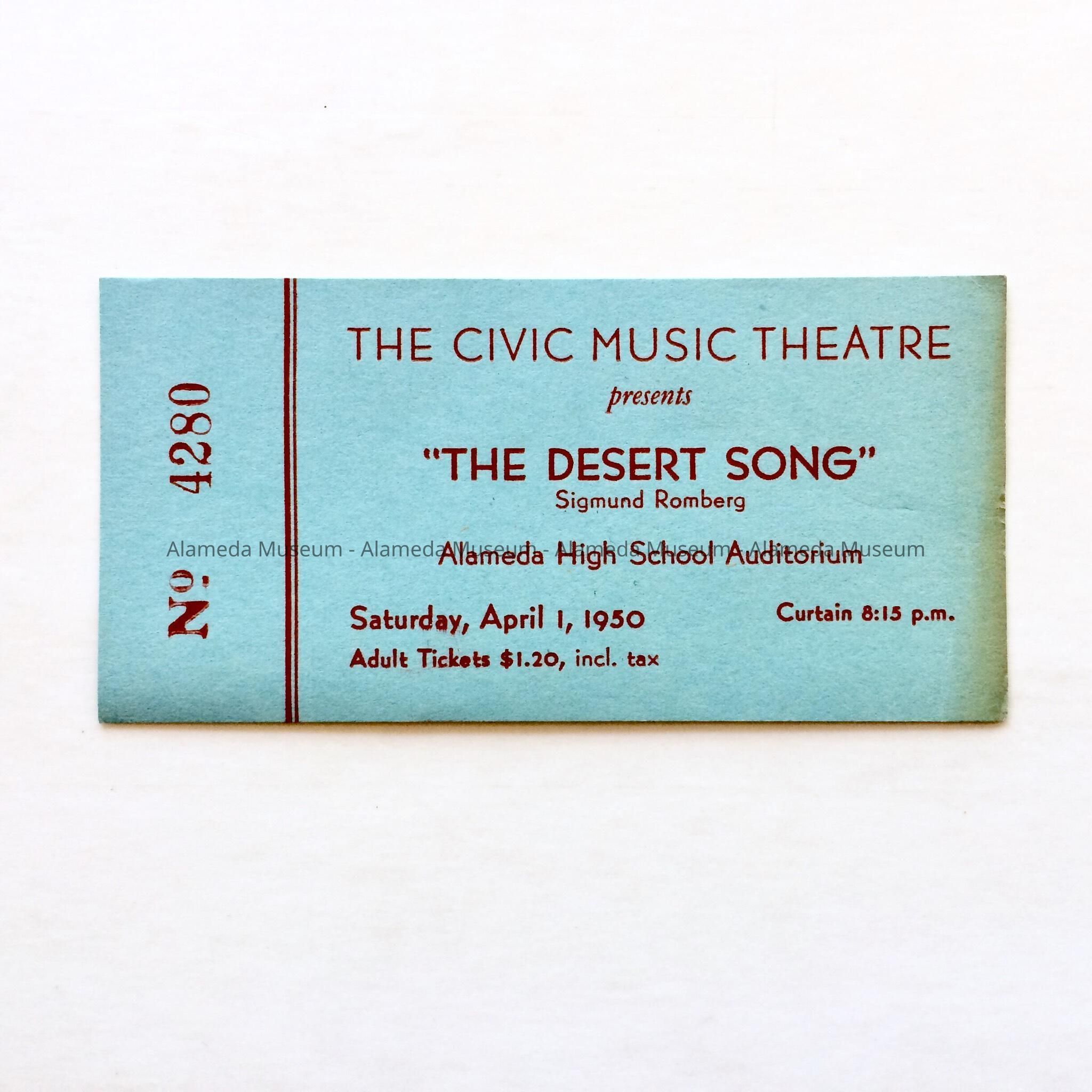 AN UNUSED TICKET, DATED SATURDAY, APRIL 1, 1950, TO THE MUSICAL, "THE DESERT SONG," PERFORMED IN THE ALAMEDA HIGH SCHOOL AUDITORIUM.