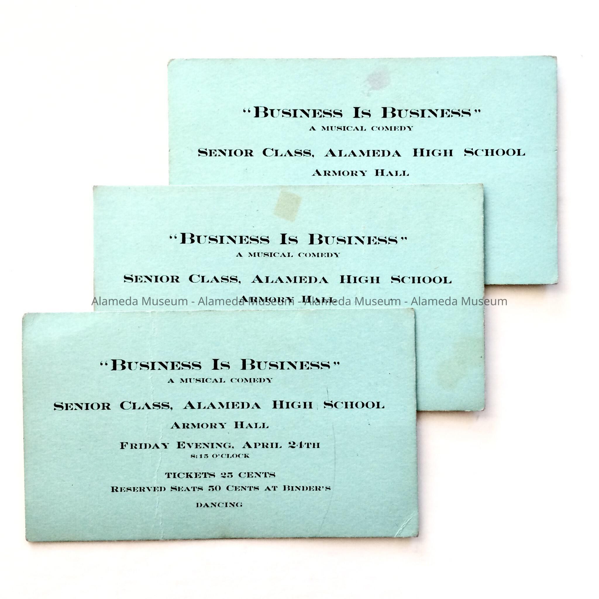 Tickets to Alameda High School Senior Class Play, 'Business is Business', early 1900sEntry/Object ID