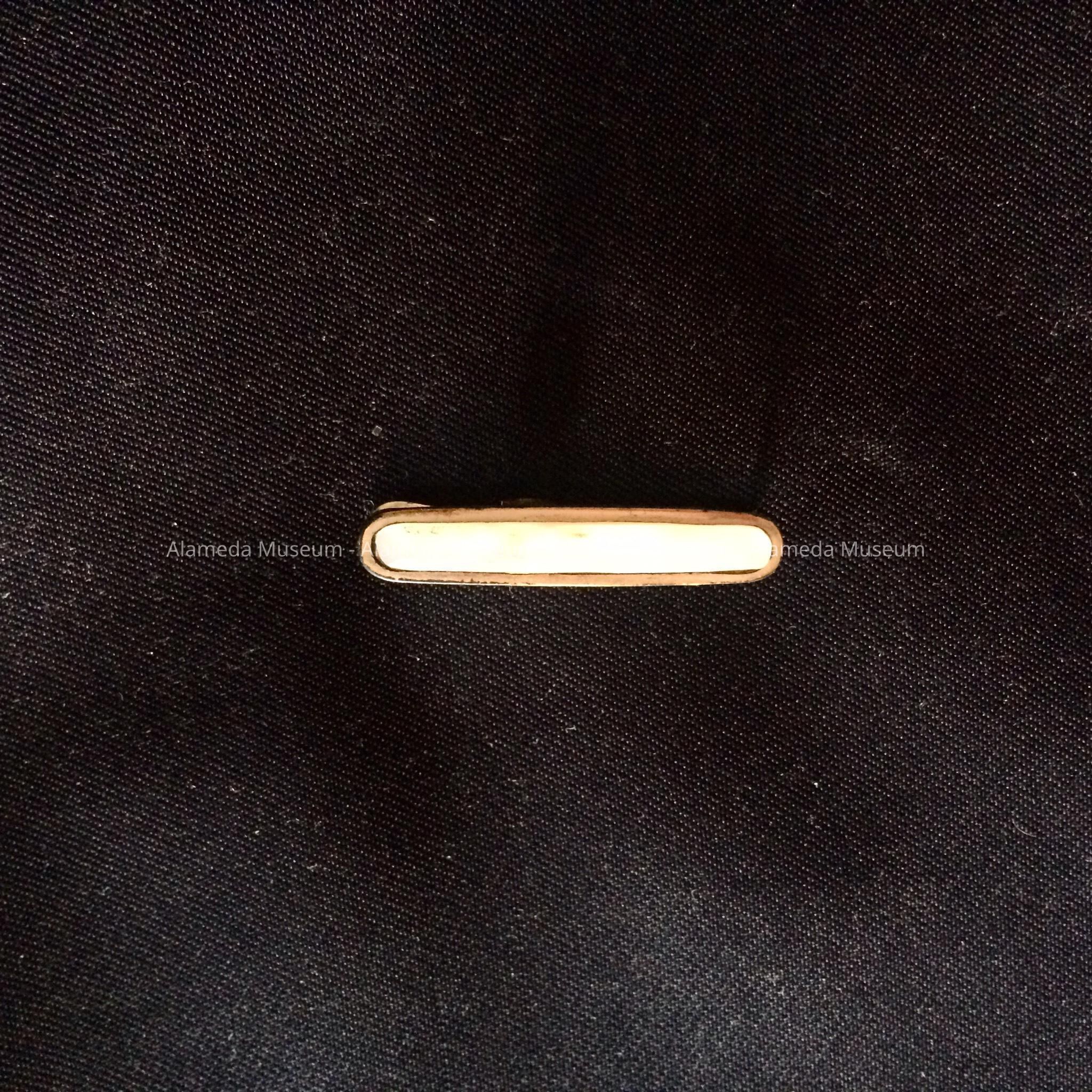 Description: hinged brass bar clip with rounded ends, with mother of pearl inlay. Hinges on a spring ]-operated hinge on the back.