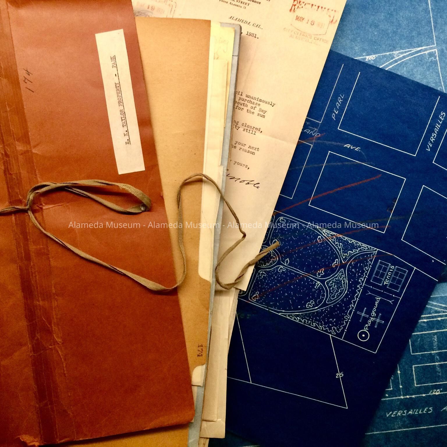 History of Object: Correspondence (including pro/con petitions), and (blueprint) maps about a proposed, but ultimately unrealized new park, proposed name, Edward K. Taylor Park, on the ‘Stanford’ (Stanford University) property of tidelands at the foot of Pearl Street. Also proposal to ‘square’ Franklin Park and use part of the park as a playground.