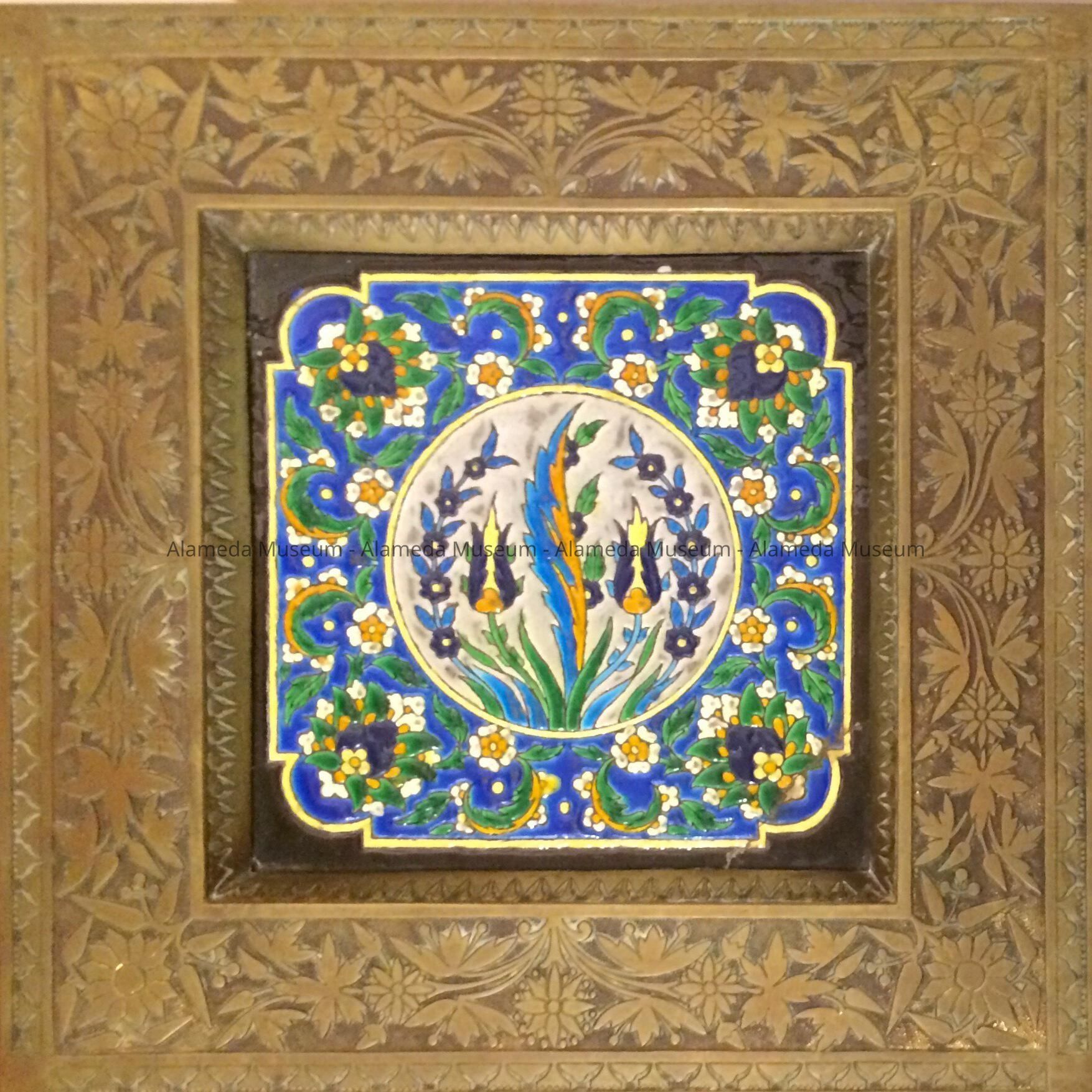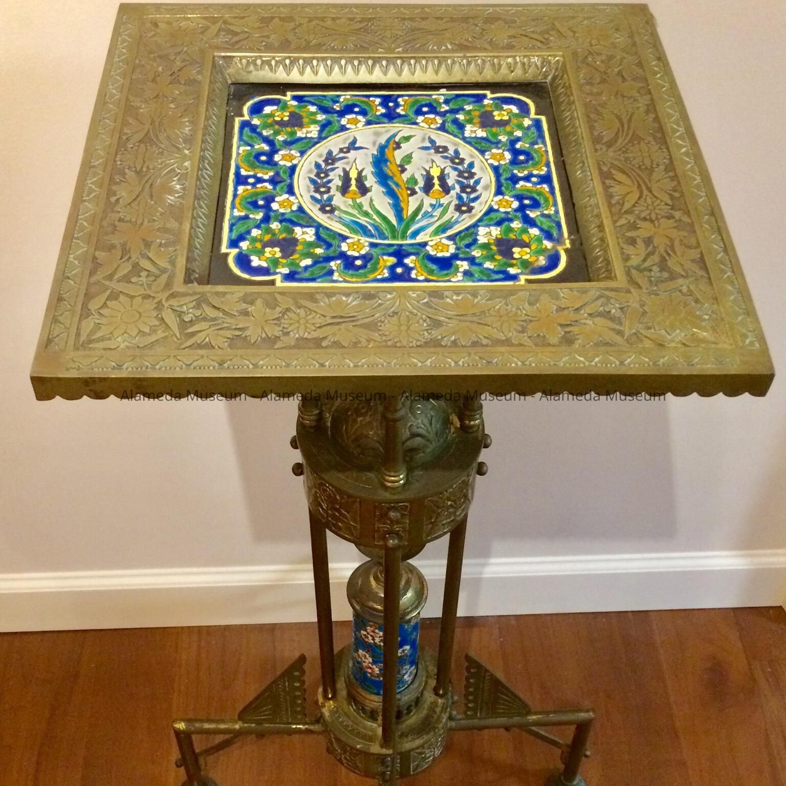 SQUARE-TOP STAND OR TABLE. THE TOP IS BRASS, WITH AN INSET PANEL OF GLAZED TILE. TILE IS ALSO REPEATED AS A CYLINDER IN THE PEDESTAL BASE. THE STAND IS SUPPORTED BY FOUR LEGS, WITH PAD FEET. EACH TABLE LEG HAS A CURIOUS PIERCED DECORATIVE DESIGN IN THE FORM OF A WING.
