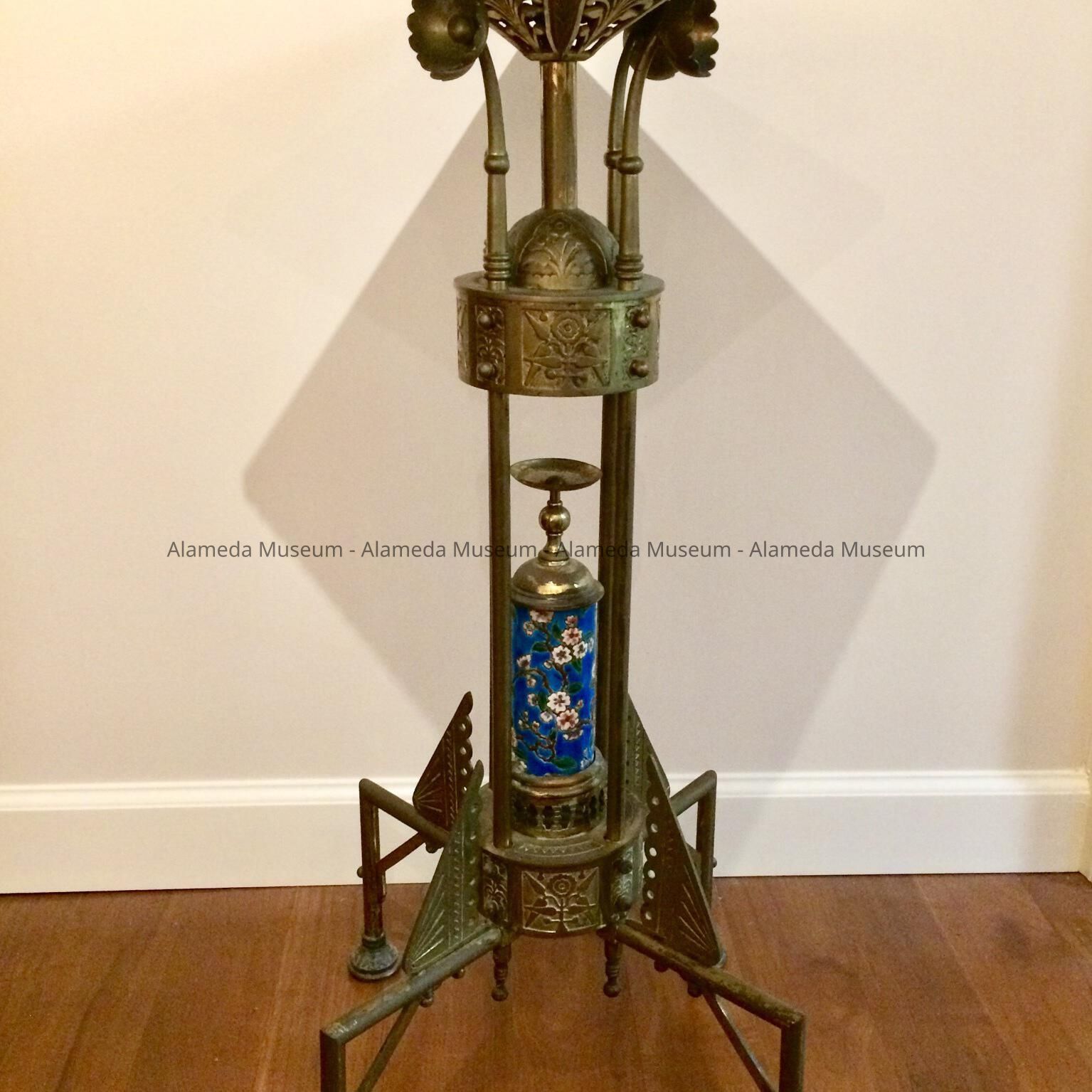 This brass stand is from the residence of John A. Plummer, a salt producer, at 2137 Clinton Ave. The stand is attributed to Bradley & Hubbard, mfr. of lamps and chandeliers. The glazed terra cotta segment is from France.