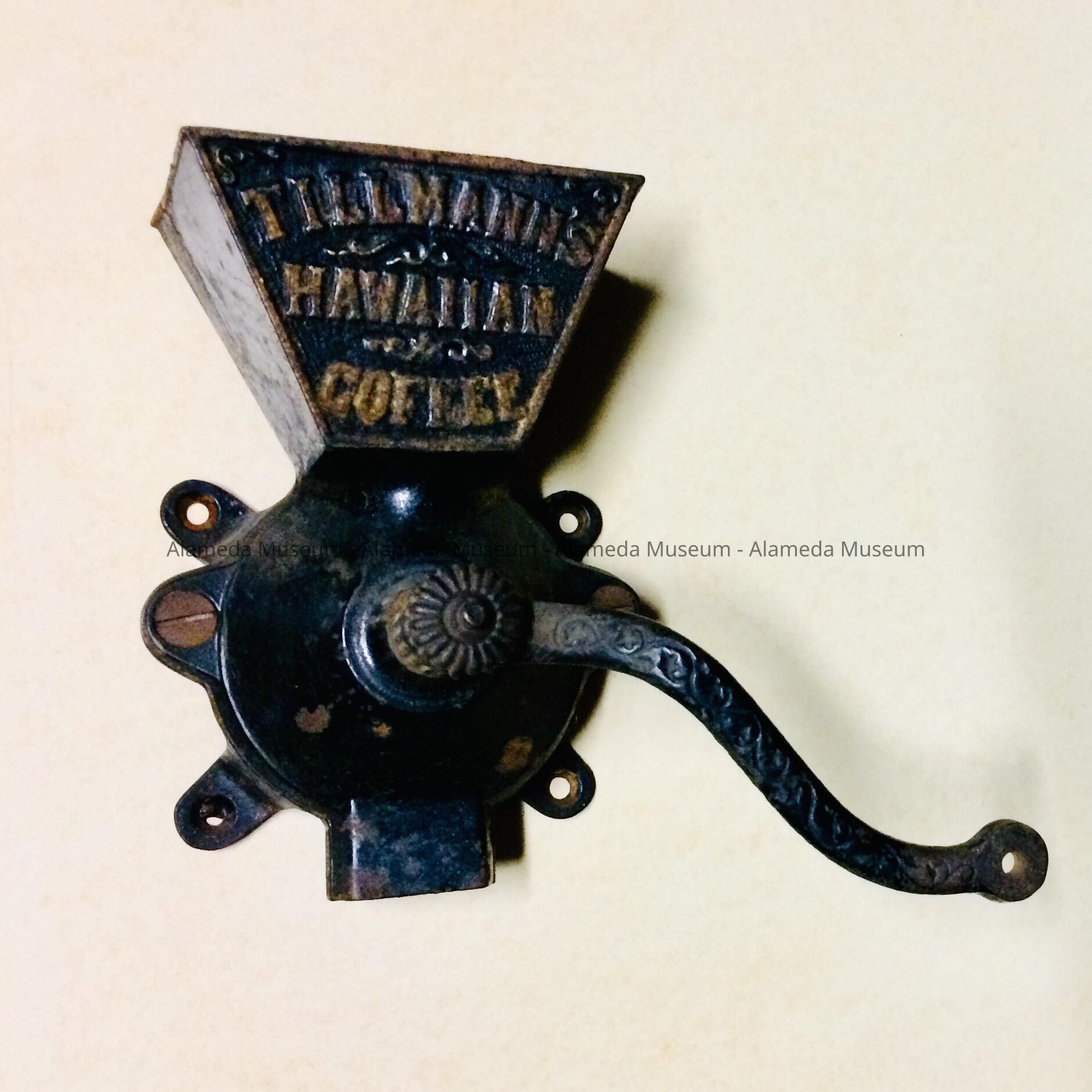 Description: A hand crank, cast iron coffee grinder with an inscription on the coffee reservoir, "Tillmann's Hawaiian Coffee." The grinder has a japanned finish.