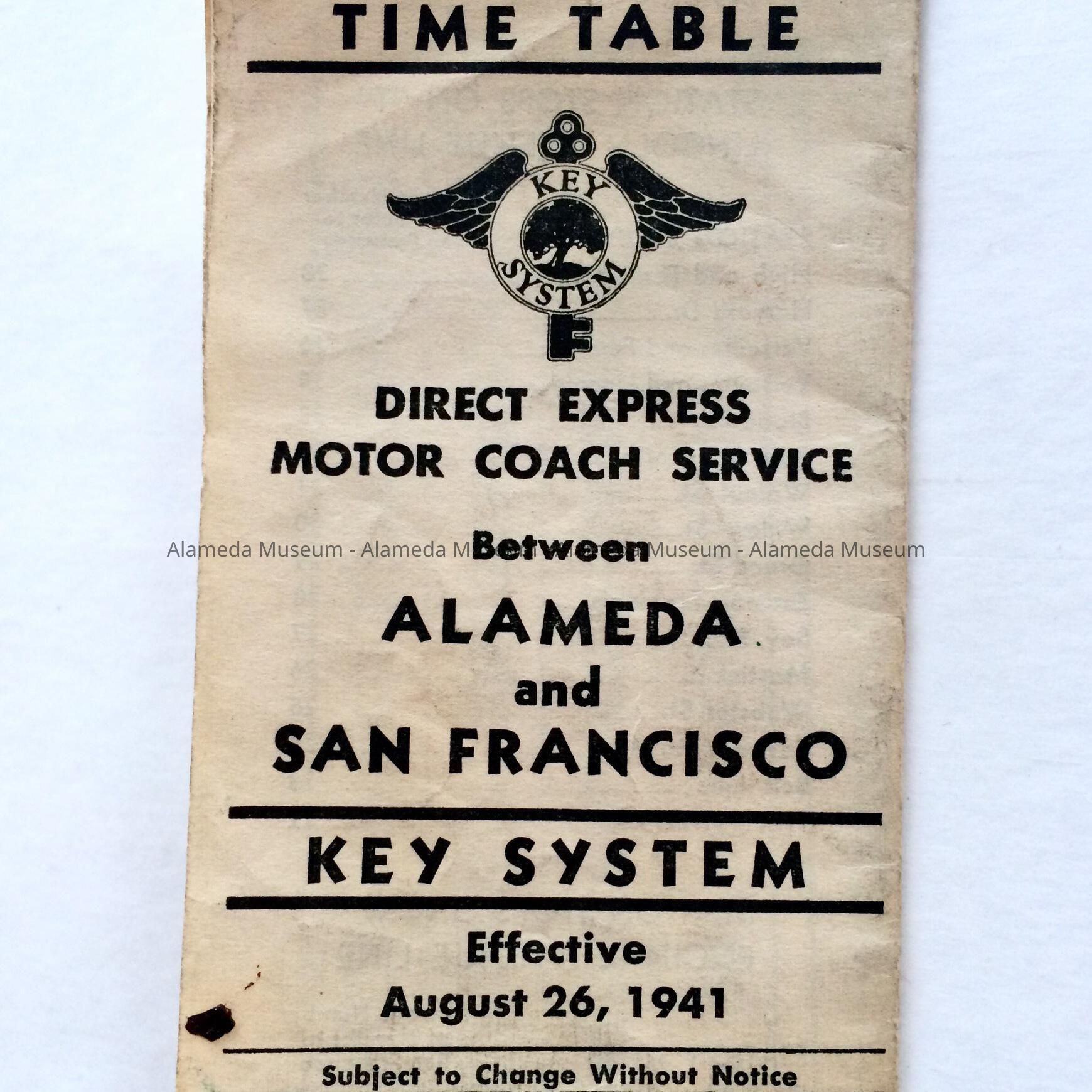 Description: Folding time table, with bold heading "Direct Express Motor Coach Service Between Alameda and San Francisco, Key System" and Key System emblem on cover flap.