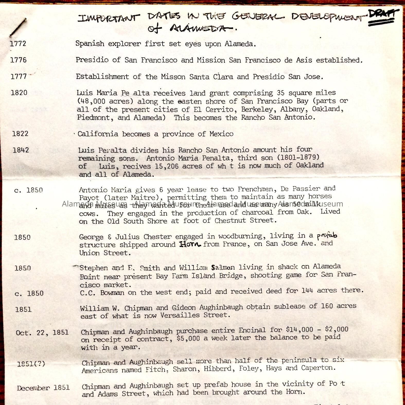 HISTORY OF OBJECT: A TIMELINE GIVING HISTORICAL EVENTS FOR ALAMEDA, BEGINNING IN 1772 AND ENDING IN 1970.