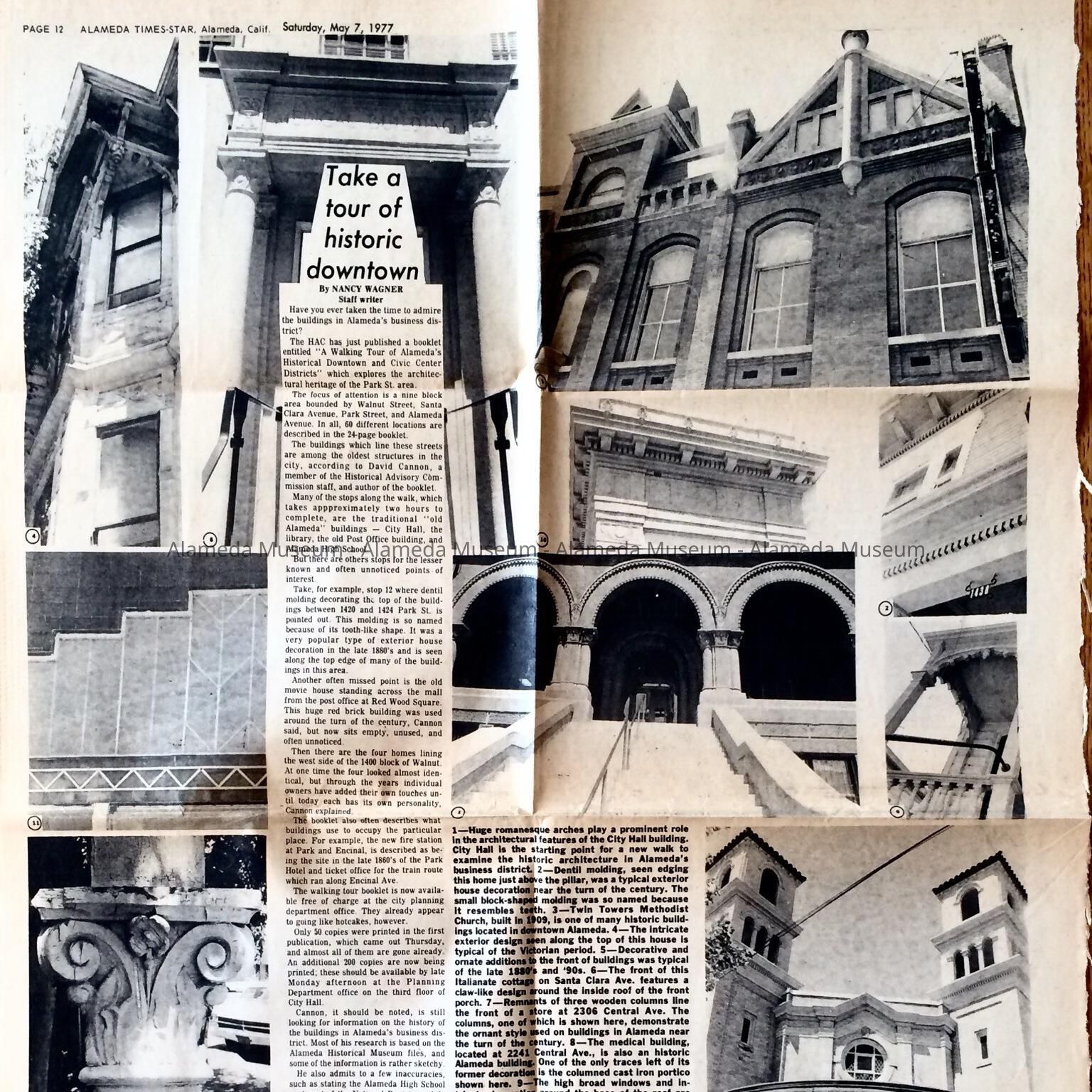 AN ARTICLE WITH ILLUSTRATIONS CONCERNING A WALKING TOUR OF BUILDINGS LOCATED IN THE VICINITY OF PARK STREET, INCLUDING CITY HALL, METHODIST CHURCH, ETC. PUBLISHED ON MAY 7, 1977 IN THE "ALAMEDA TIMES STAR" NEWSPAPER.