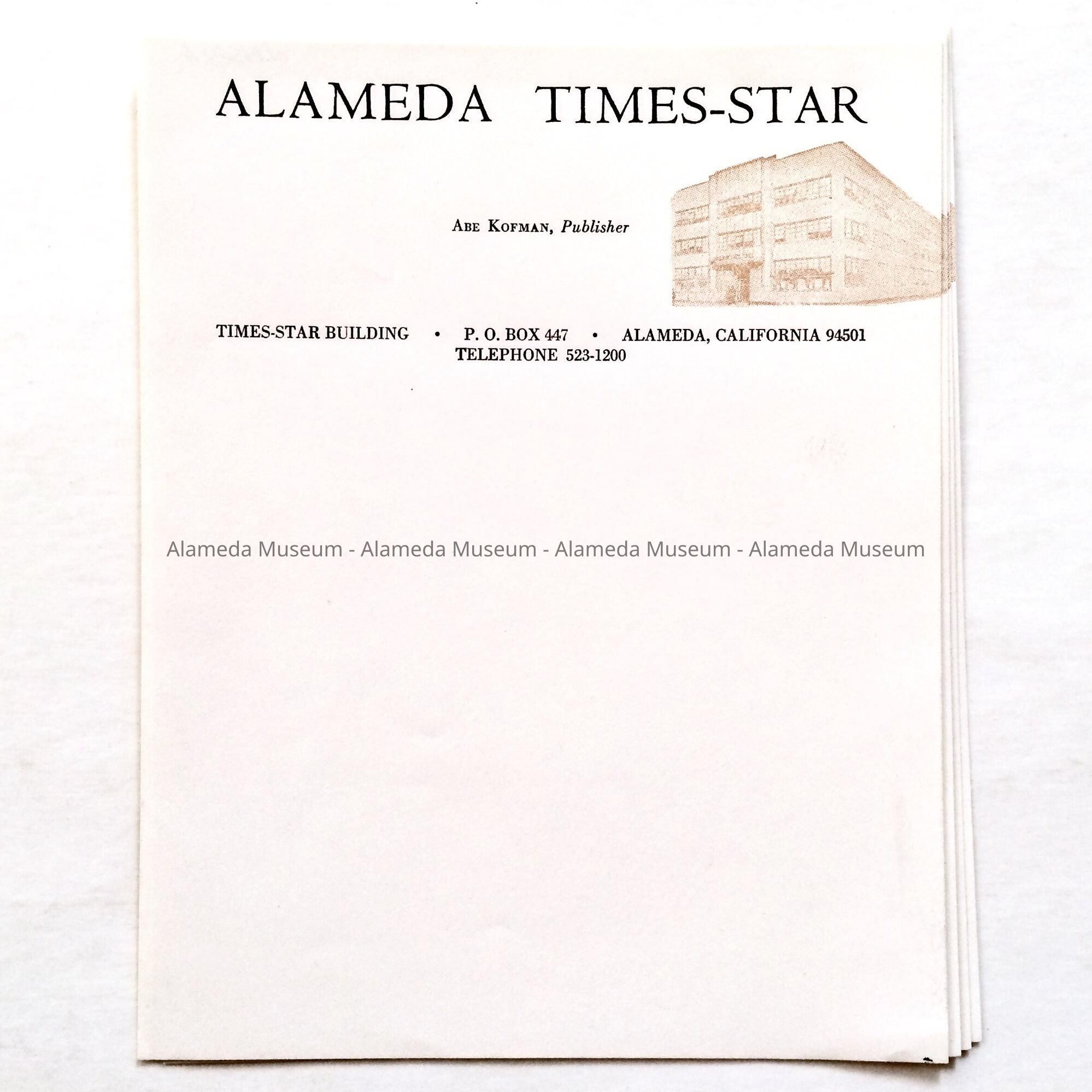 Description: 4 pieces of cream-colored paper, with an image of a sepia-printed photo of a 3-story building in the top right. Heading in bold deep purple type ‘Alameda Times-Star’. Below: Abe Kofman, publisher. Address: Times-Star Building, P.O. Box 447, Alameda, California.