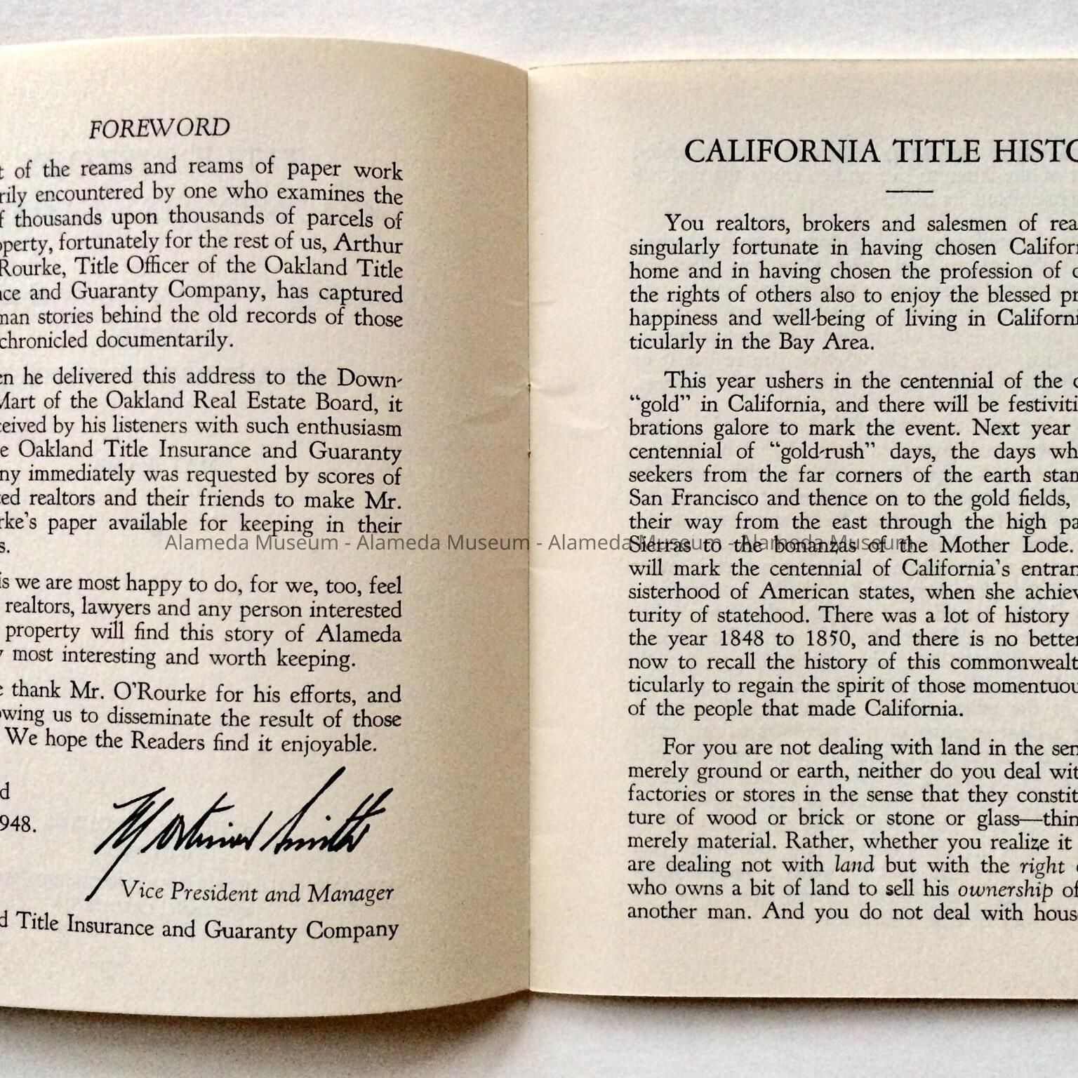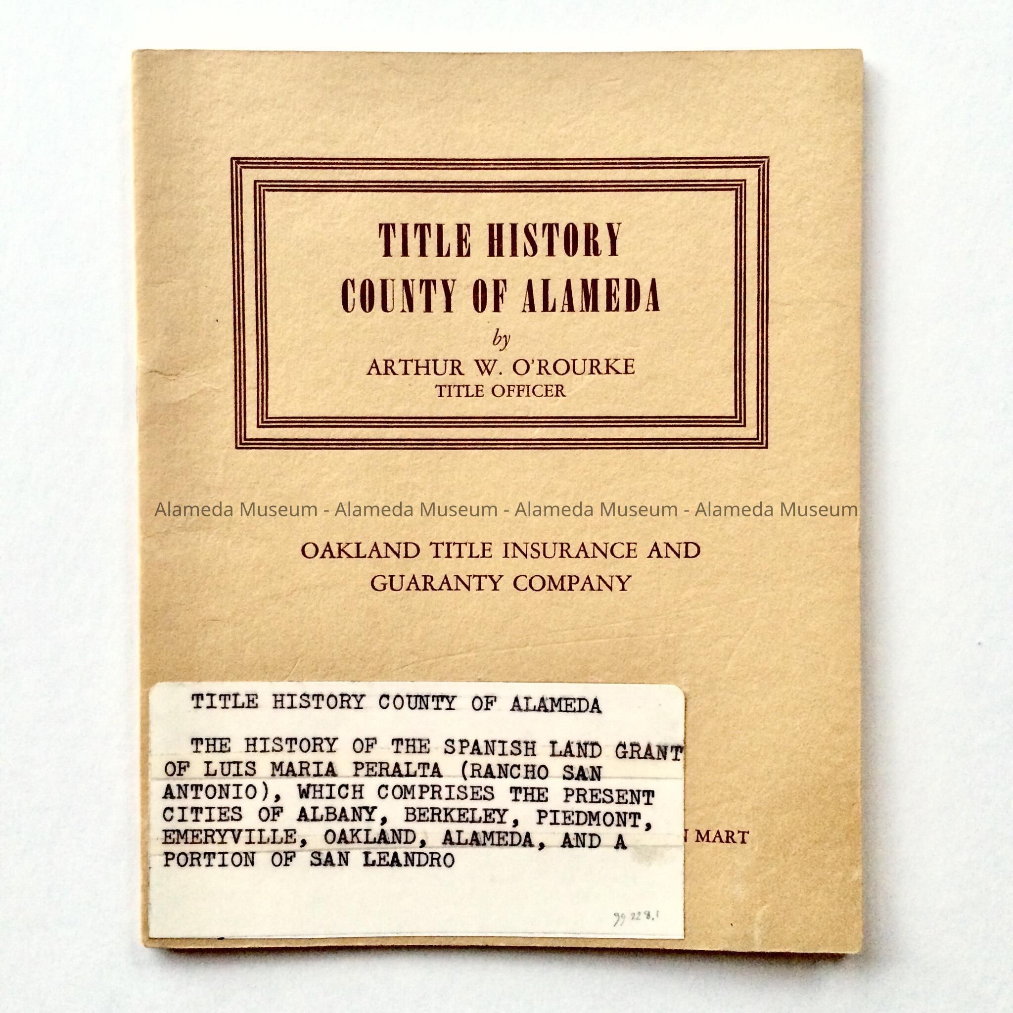 History: Booklet titled, The History County of Alameda, by Arthur W. O'Rourke, printed by Oakland Title Insurance Company and issued May 4, 1948. There is a section in the publication that refers to Rancho San Antonio, the Peraltas and early Alameda.