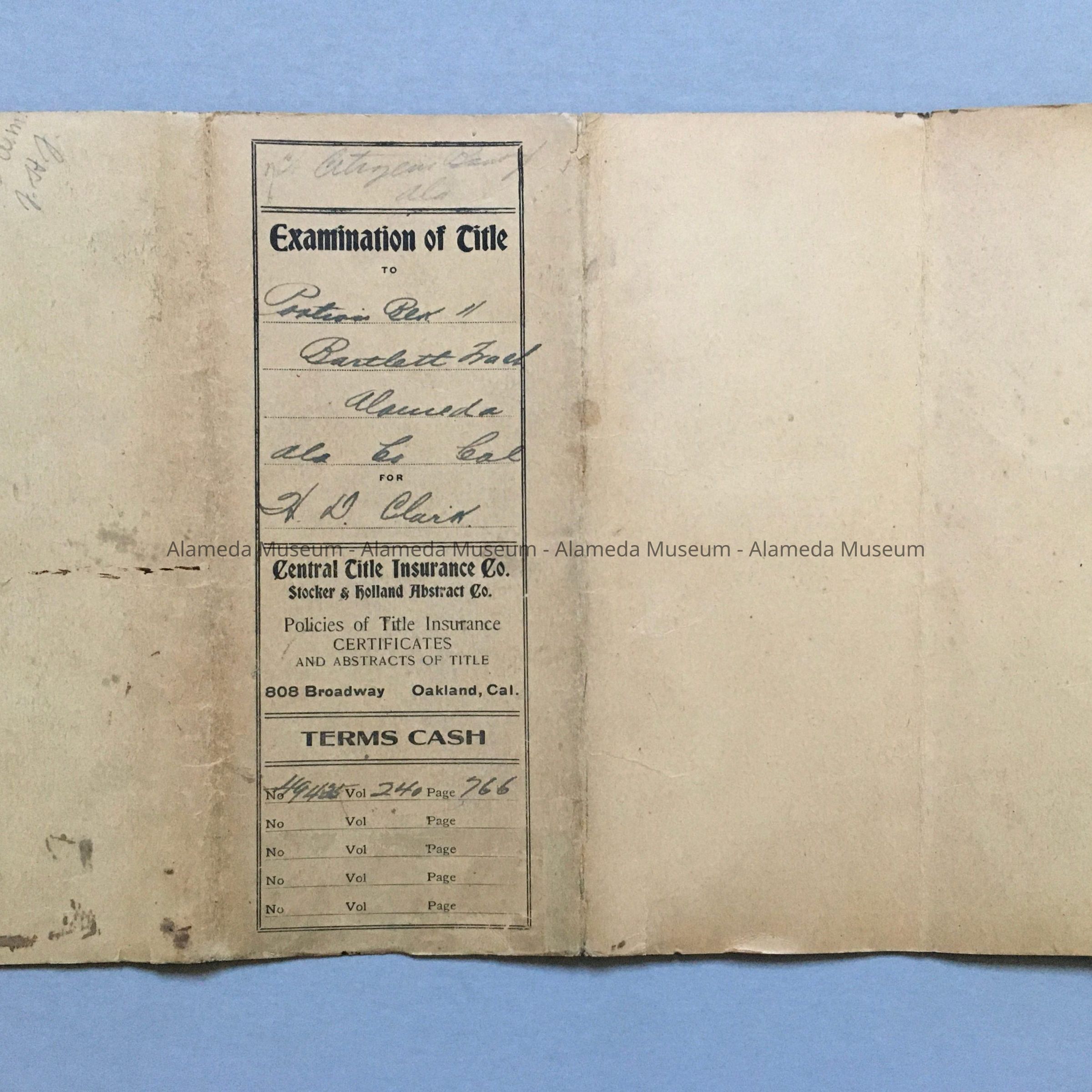 History of Object: In summation it gives the legal description of the property (1823 San Jose Avenue) and that the title is free of any claims or judgements, and that the taxes are paid.