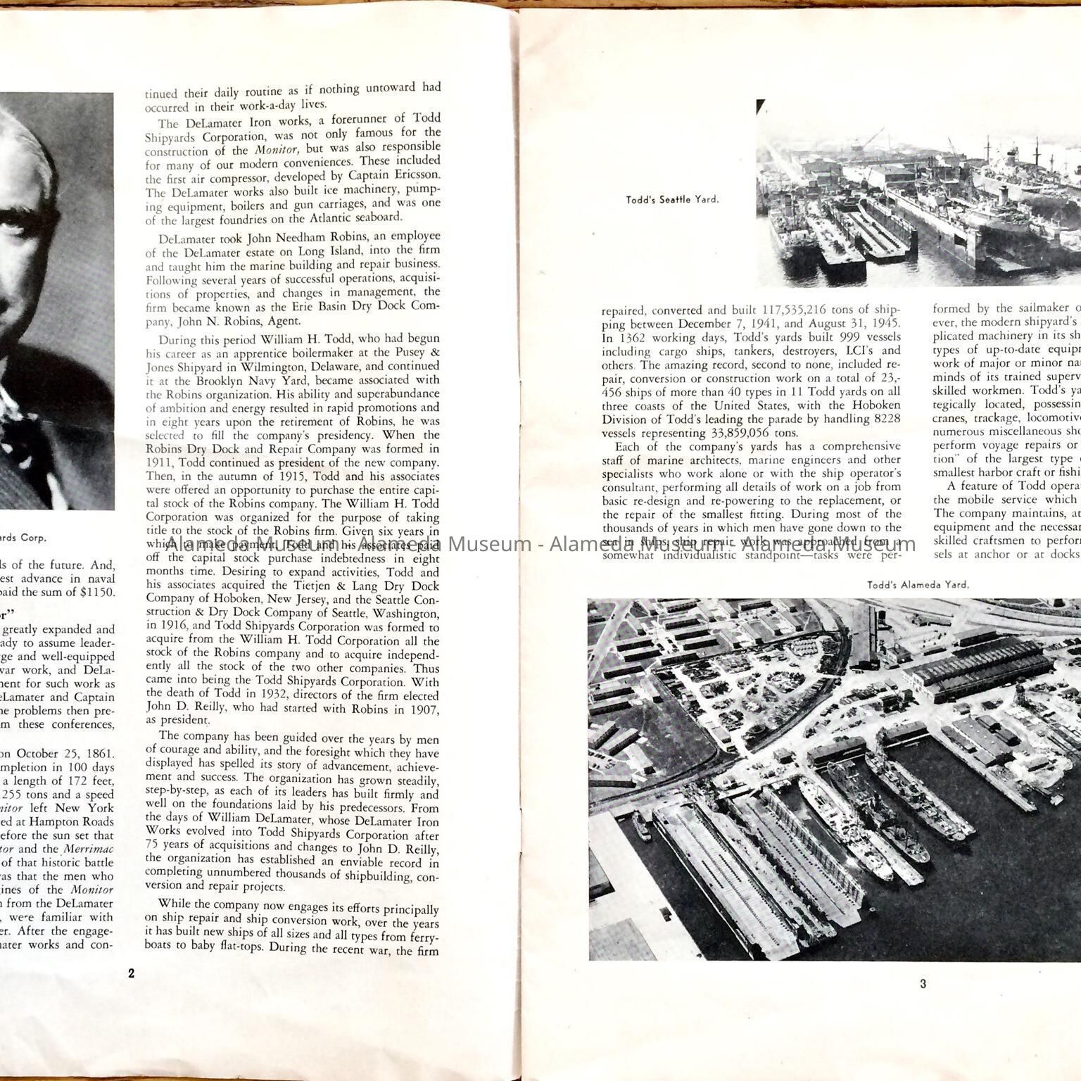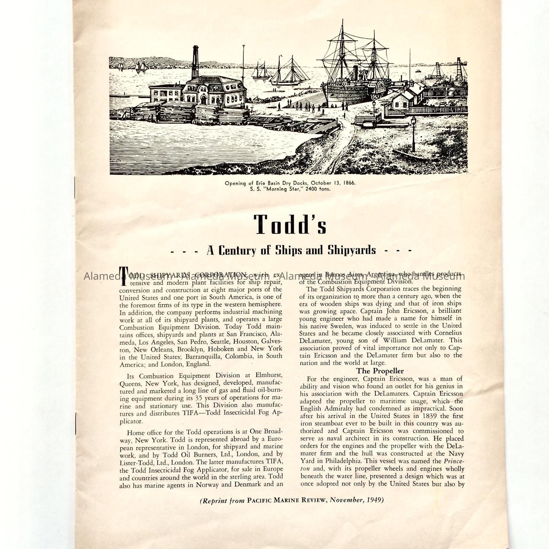 A HISTORY OF THE TODD SHIPYARD, WHICH MENTIONS THE ALAMEDA DIVISION. ALSO DISPLAYED IS AN AERIAL VIEW OF THE SHIPYARDS.