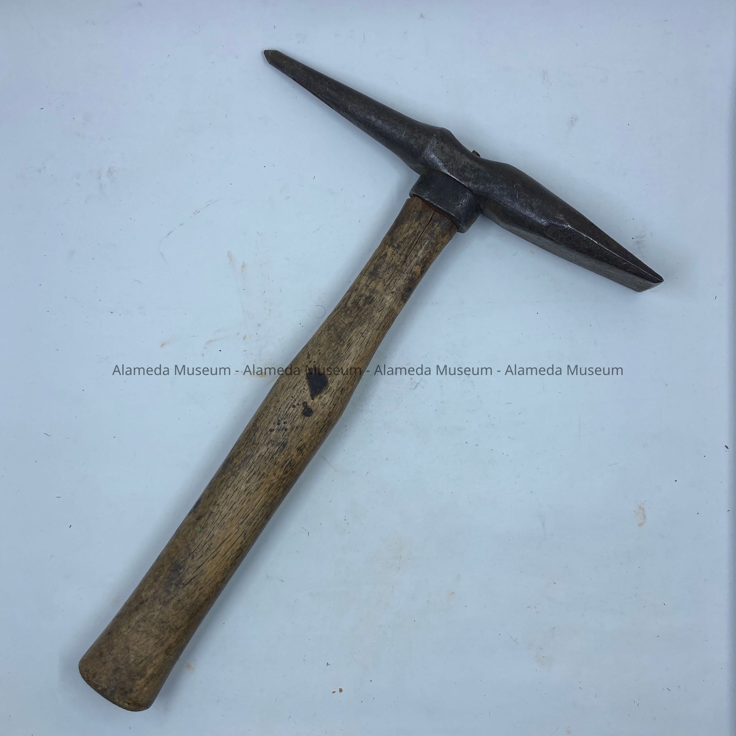 History of Object: pickaxe, part of a collection of carpentry tools, owned by John Ucovich (presumed), an immigrant carpenter from Montenegro. John Ucovich moved to Alameda around 1925, and ran a trucking business in Oakland. By 1938 John (aged 61) lived with his wife, Myrtle May, at 775 Santa Clara. He died as the result of injuries sustained after being run over by a streetcar on March 28, 1938.